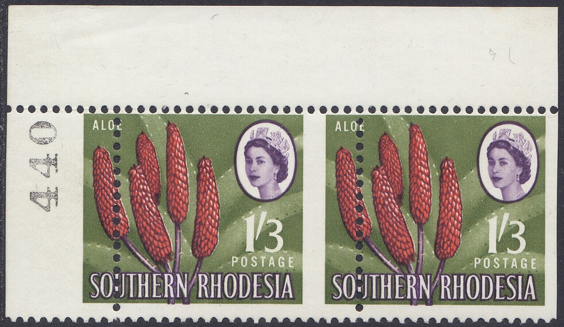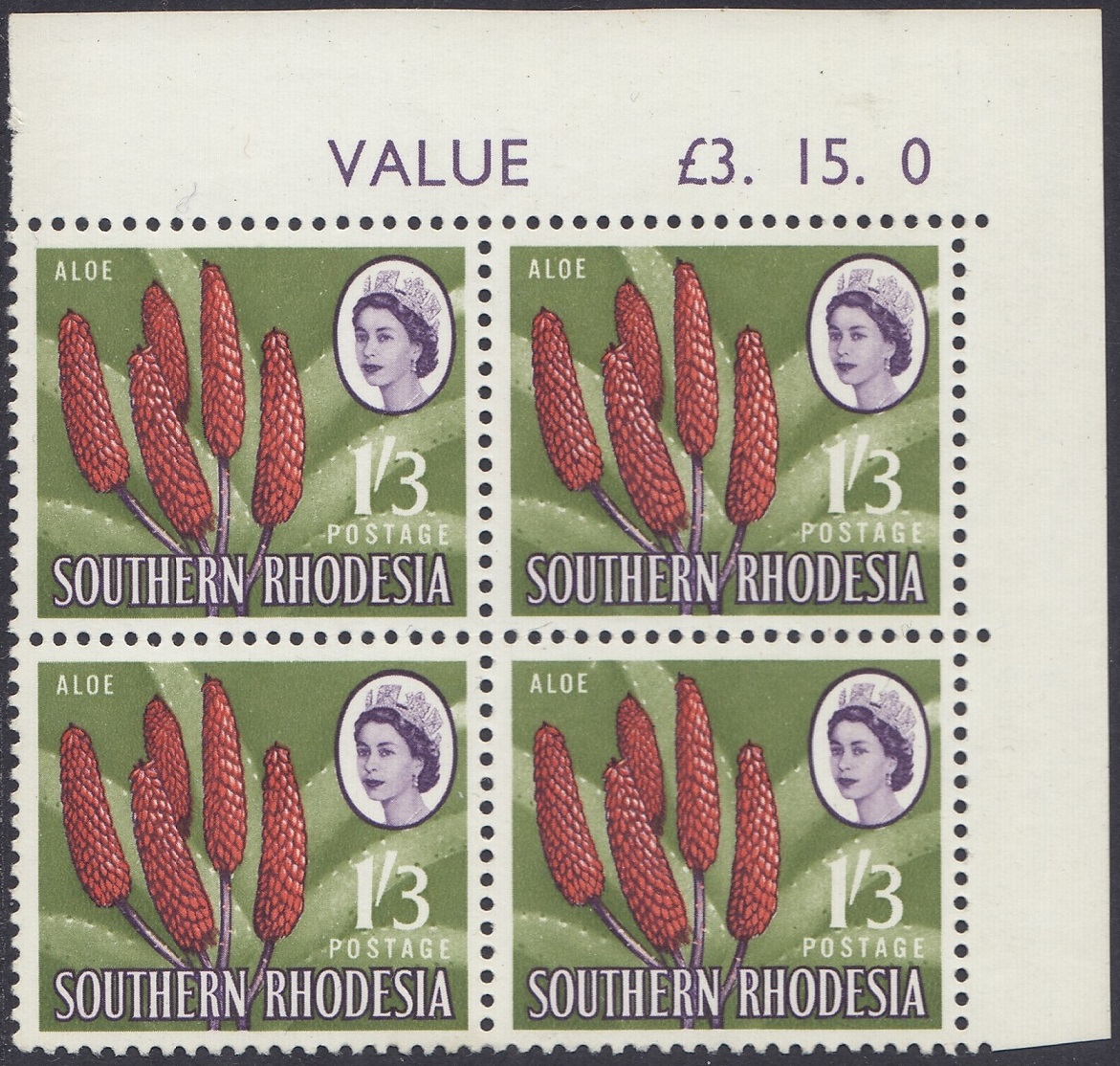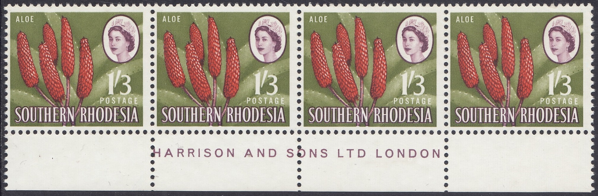 Kodachrome transparencies and a coloured picture from a tourist brochure, Aloes and Cycads, provided a guide to this formalized interpretation of the extraordinary Aloe excelsa, which in some districts grows tree-like to a height of 20 feet, but usually to 10 or 12 feet. The brown-red “pinnacles”, not unlike the corncob on the 1d, have overlapping petals similar to a fir-cone and these tend to open out rather more than is shown in the artwork. The artist’s ghostly suggestion of the leaf form is, however, most effective as a background. Note the spikes or thorns which fringe the thick, cactuslike leaves. The succulent leaves grow at the apex of the stem to a length of 3 feet and spread over the ground like enormous octopus-tentacles. Aloes grow widely throughout Southern Rhodesia—there is a unique collection in the Ewanrigg National Park—and they flower during the winter months of June, July and August.