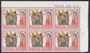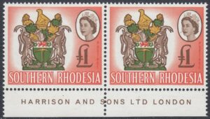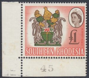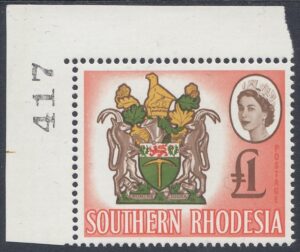 “Another four-colour stamp, the second in the series, and its source was an official coloured plate of the Arms. Here the small format necessitated some thickening of parts of the design and the overall outline for reproduction in stamp size. The vignette technique has enabled two of the four colours in the Arms, the brown and vermilion, to be used also for the Queen’s portrait and value, and for the background. The shield shows a golden pick (“the pioneers who dug for gold”) and above it a lion passant between two thistles (the Rhodes’ family arms). Sable antelopes are the supporters and above the shield is a gold and green crest bearing the Great Zimbabwe Bird (a soapstone bird taken from the ancient ruins of Zimbabwe), now a symbol of Rhodesia. Beneath the shield is the motto Sit Nomine Digna—”Let Rhodesia be worthy of her name”.”