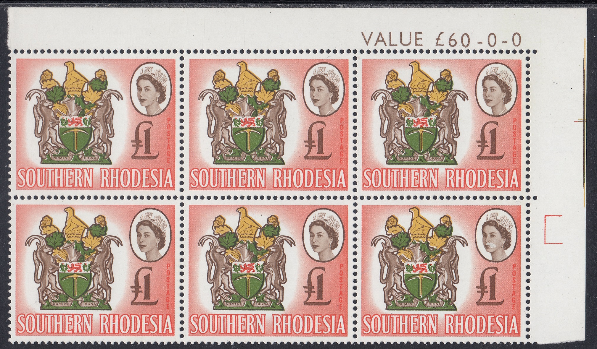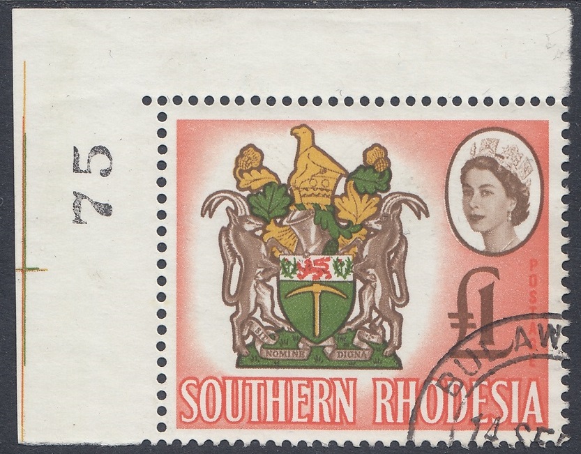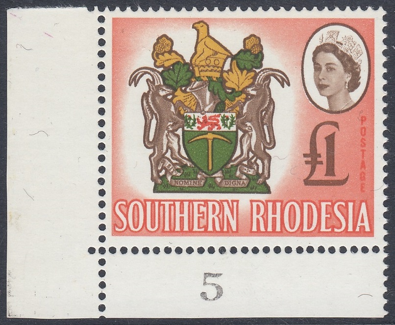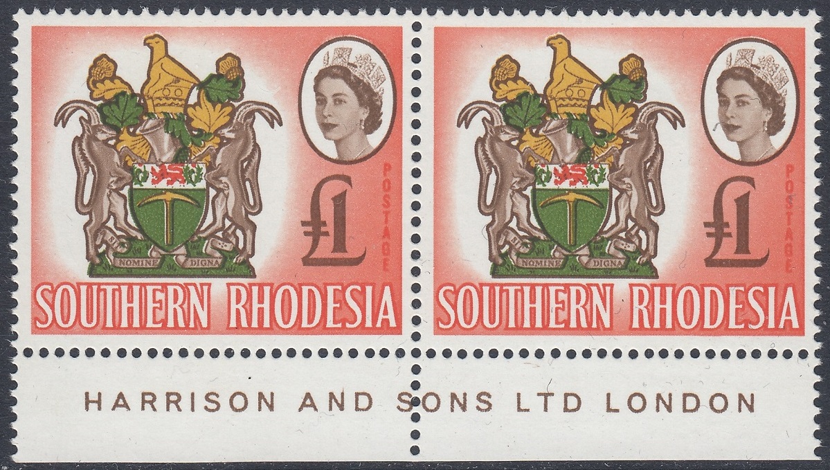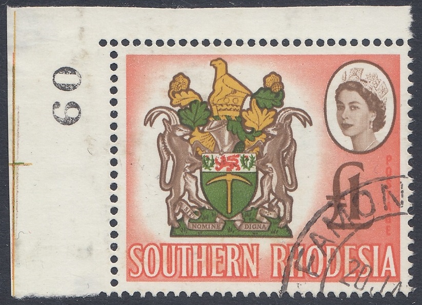 “Another four-colour stamp, the second in the series, and its source was an official coloured plate of the Arms. Here the small format necessitated some thickening of parts of the design and the overall outline for reproduction in stamp size. The vignette technique has enabled two of the four colours in the Arms, the brown and vermilion, to be used also for the Queen’s portrait and value, and for the background. The shield shows a golden pick (“the pioneers who dug for gold”) and above it a lion passant between two thistles (the Rhodes’ family arms). Sable antelopes are the supporters and above the shield is a gold and green crest bearing the Great Zimbabwe Bird (a soapstone bird taken from the ancient ruins of Zimbabwe), now a symbol of Rhodesia. Beneath the shield is the motto Sit Nomine Digna—”Let Rhodesia be worthy of her name”.”