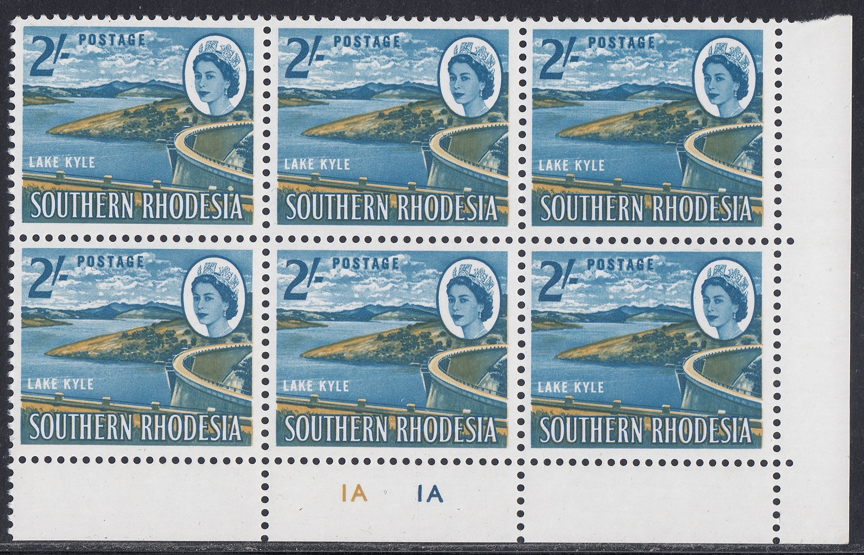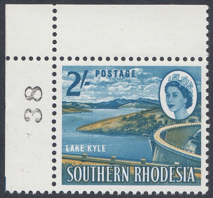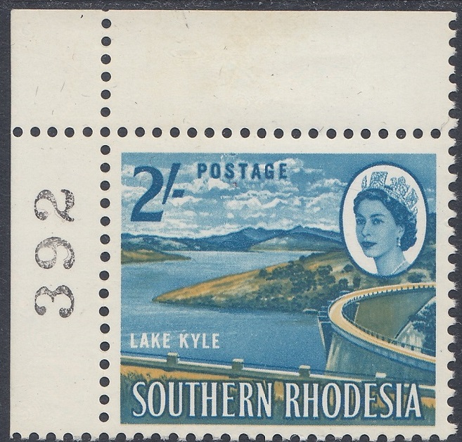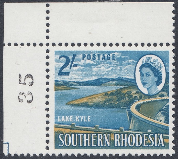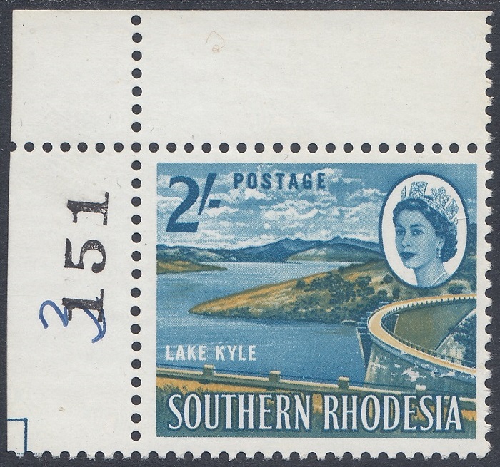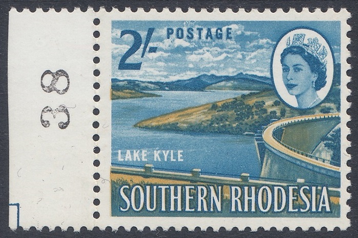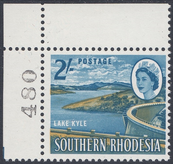 “Another magazine picture, with emphasis on the lake waters and the undeveloped (foreground) verge requested of the artist, was the basic source. The latter made a suitable background for Whiteley’s cased letters, showing the advantage of this “see-through” technique. The stamp shows an amazing variety of tones derived from the two colours employed —blue and ochre. A car and human figures on the dam wall were removed as unnecessary distractions. The Kyle Dam, or “Little Kariba”, stands at a deep and narrow gorge between two hills of solid granite at the confluence of the Mtilikwe and Umshagashi Rivers, about 25 miles south-east of Fort Victoria. The wall of the dam is more than 200 feet high and about 1,025 feet in length. It cost £3 million and was opened by Sir Edgar Whitehead, former Prime Minister of Southern Rhodesia, on May 31st, 1961. The newly- created Lake Kyle covers about 23,000 acres.”