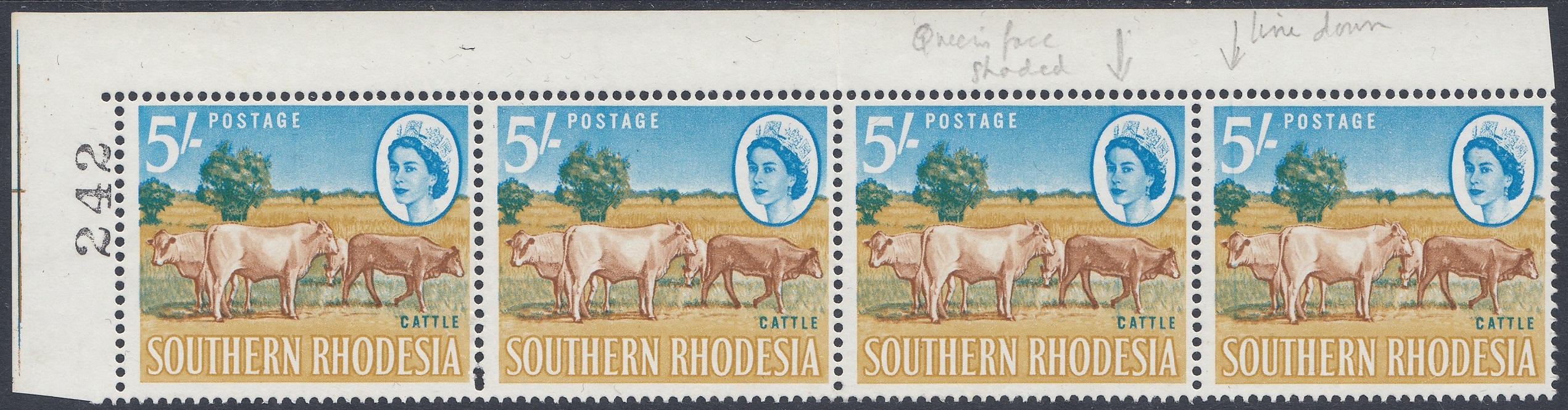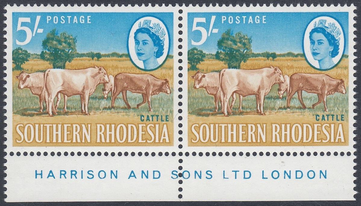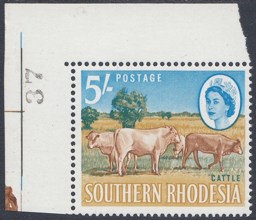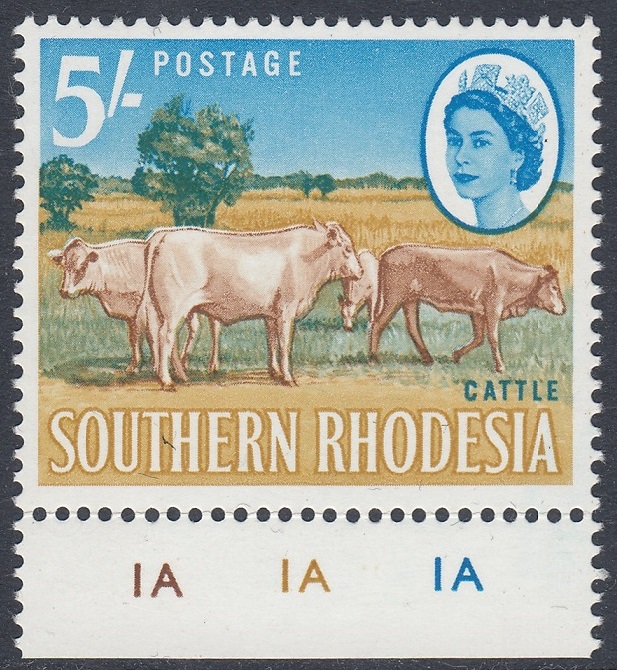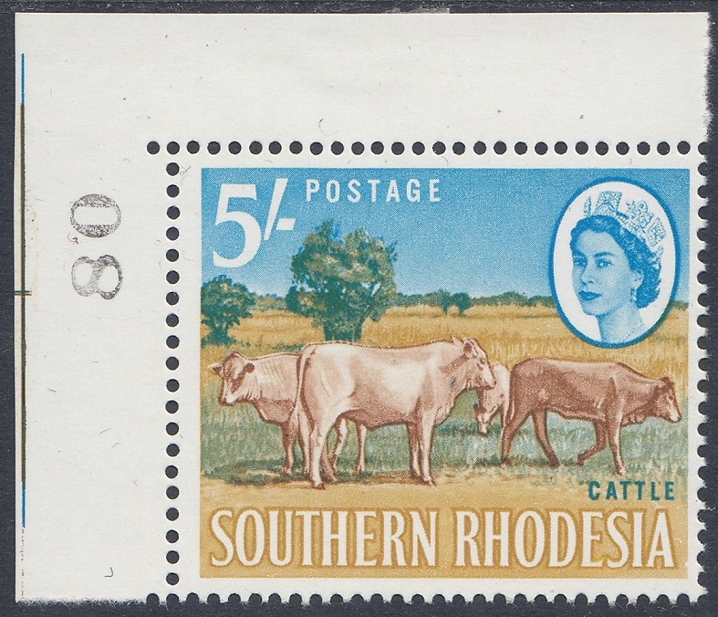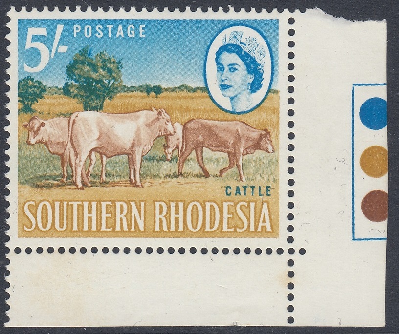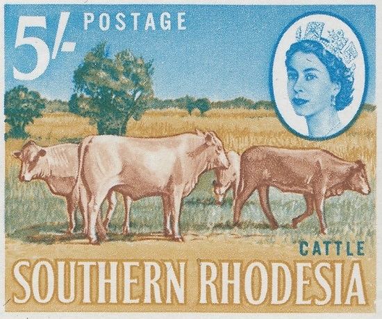 “This, eventually, became a three-colour subject. The initial drawing, in black and green, was based on transparencies of a large Hereford and a group of cattle. The golden-dun Tuli cattle on the stamp represent the second attempt to portray the Rhodesian beef industry which is expanding rapidly to meet growing export demands. For the background a “typical Rhodesian grazing pasture” was briefed, and this came from another colour transparency. The type of cattle reared for beef production varies with climatic conditions; the Tuli cattle are particularly suited to the low-rainfall, dry plains of Southern Rhodesia. Brown and bistre yellow are the dominant colours; the addition of blue for the sky tints the trees and grass conveniently green.”
