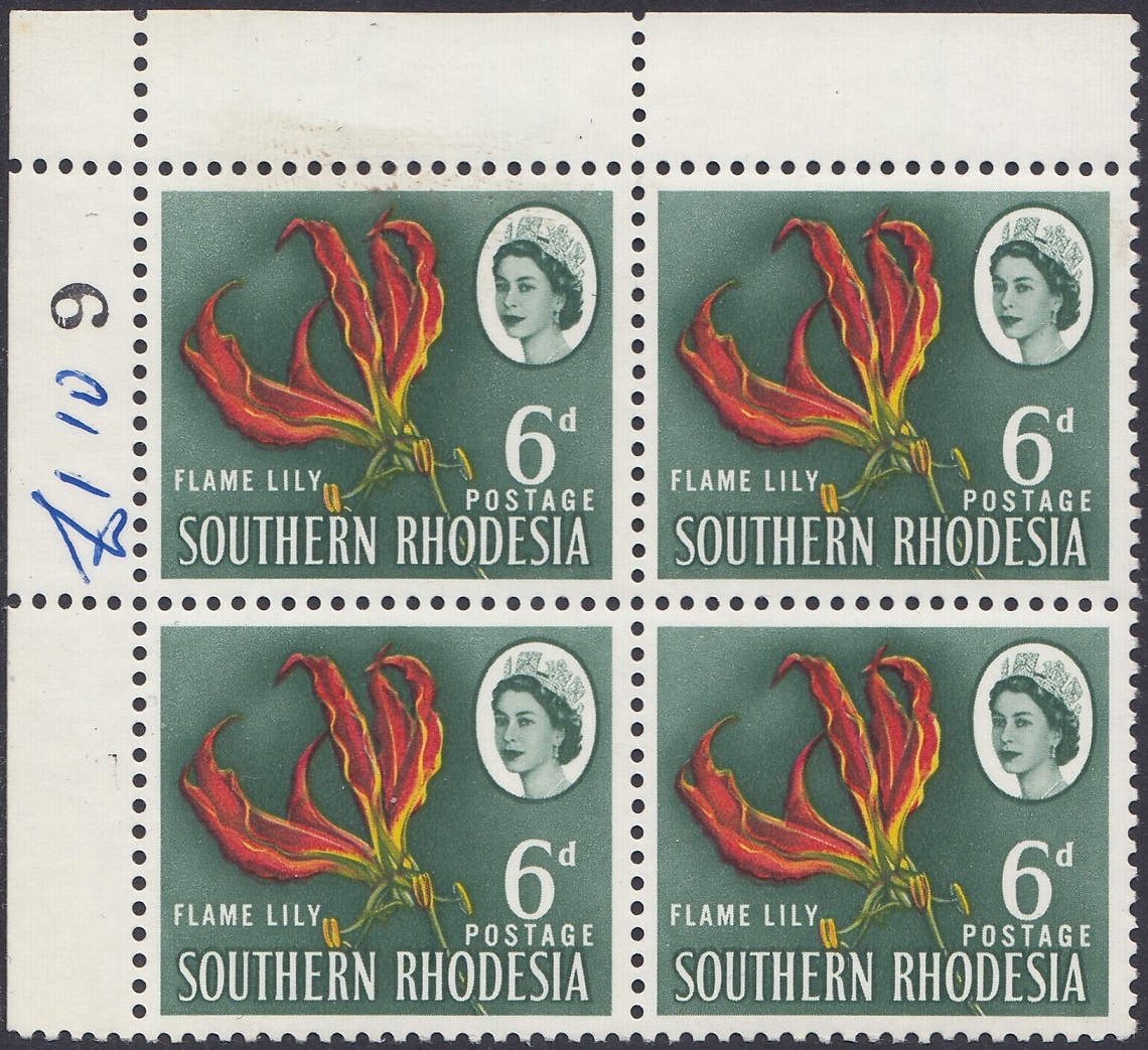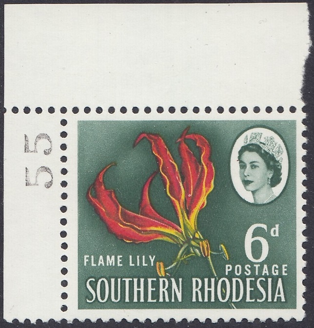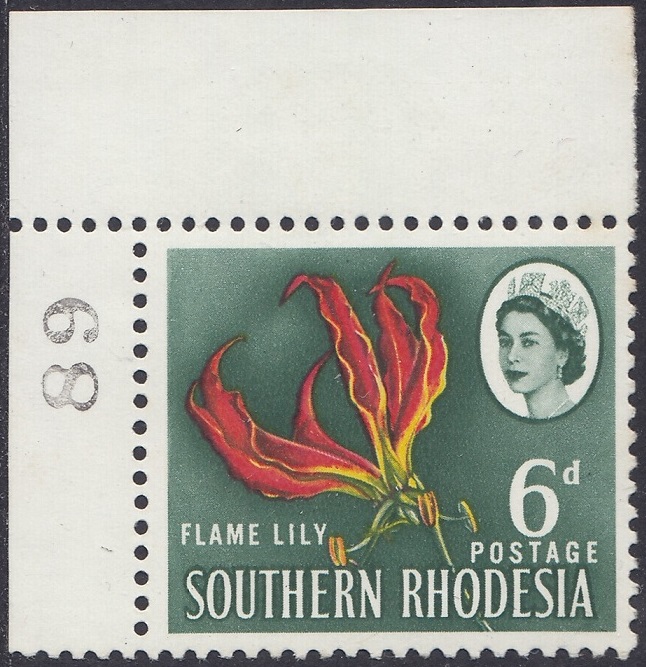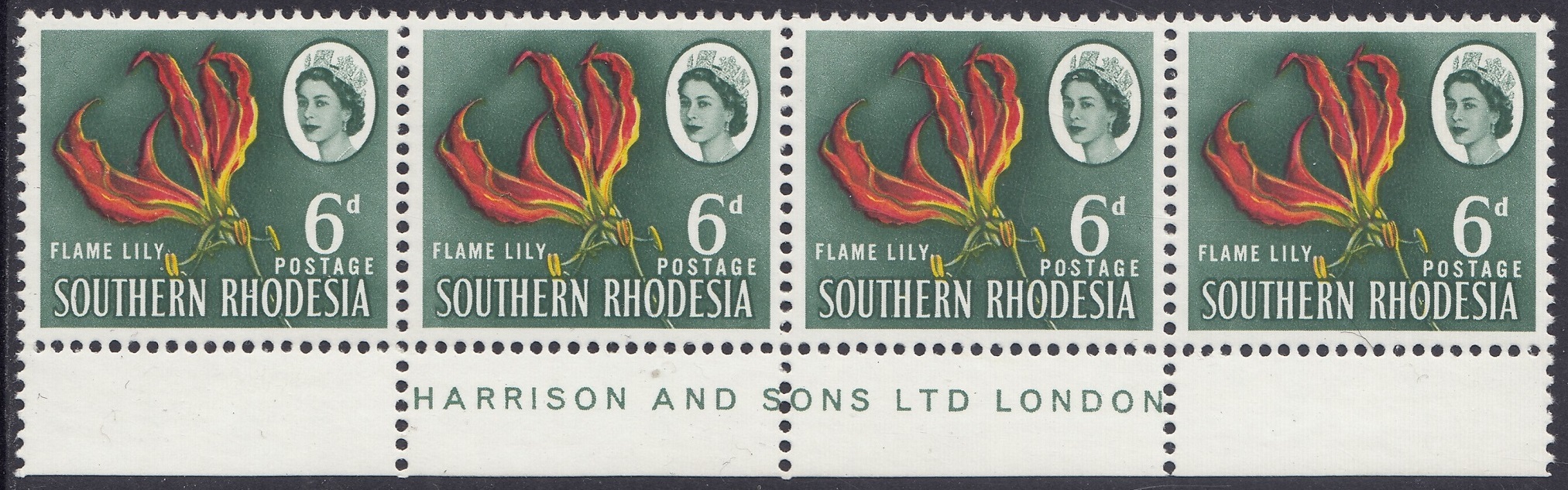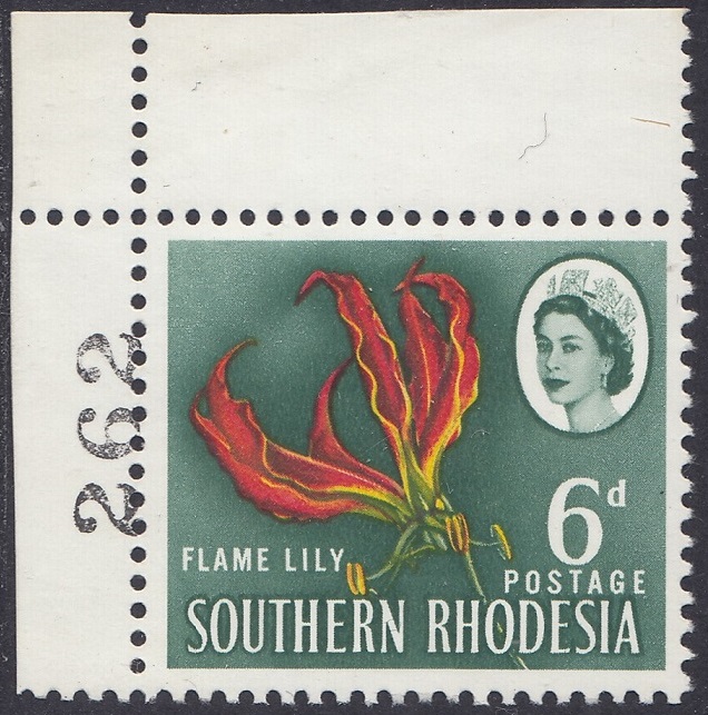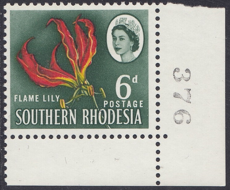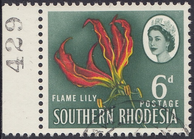 Another transparency was the source of this picture of Rhodesia’s unofficial floral emblem, the flame lily, also known as the Turk’s Cap or gloriosa lily. Originally rendered in two colours, a third colour, yellow, was found necessary and a background similar to that of the Fiji 8d. “Hibiscus” stamp (now 9d.) was requested and effected.