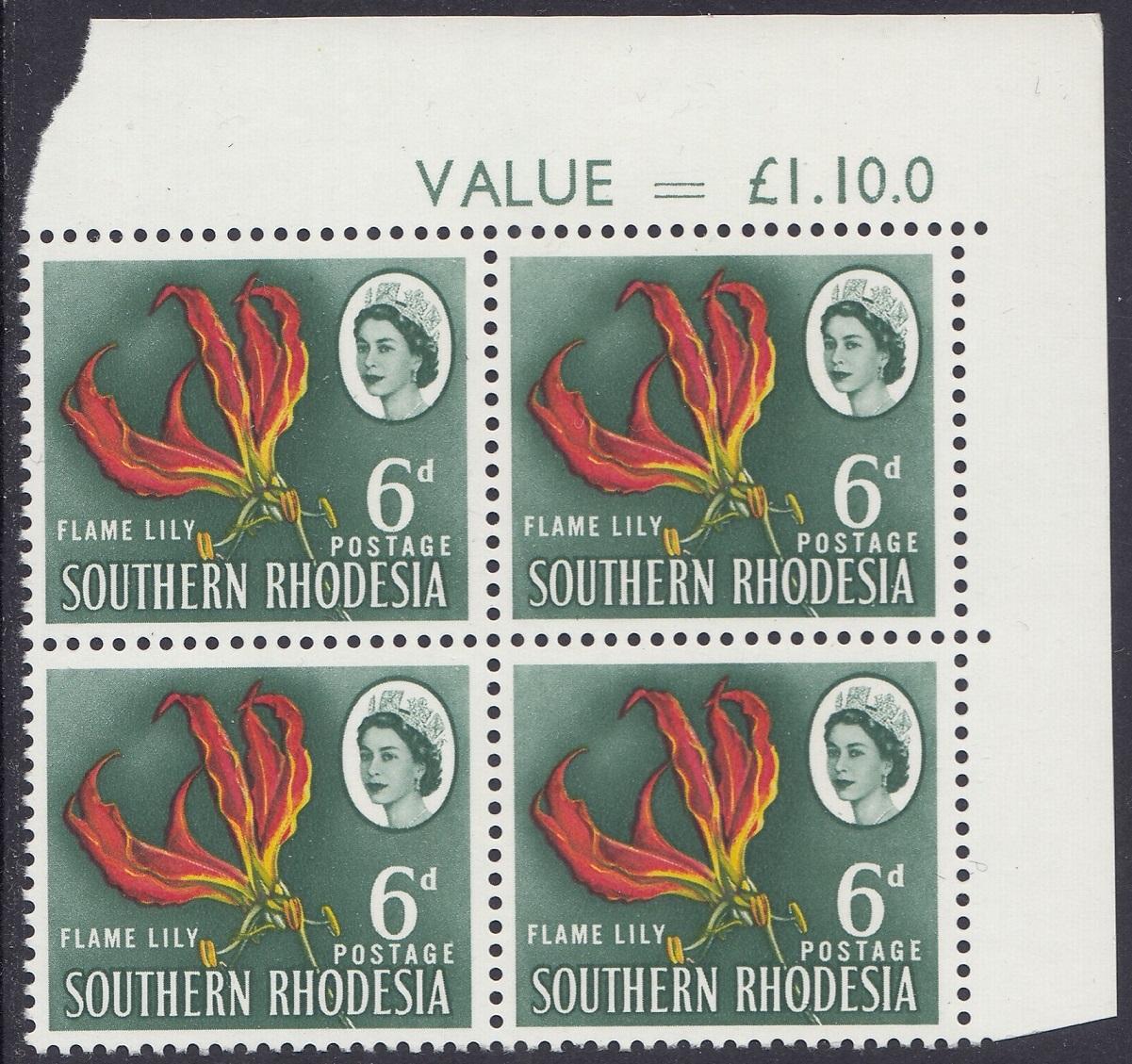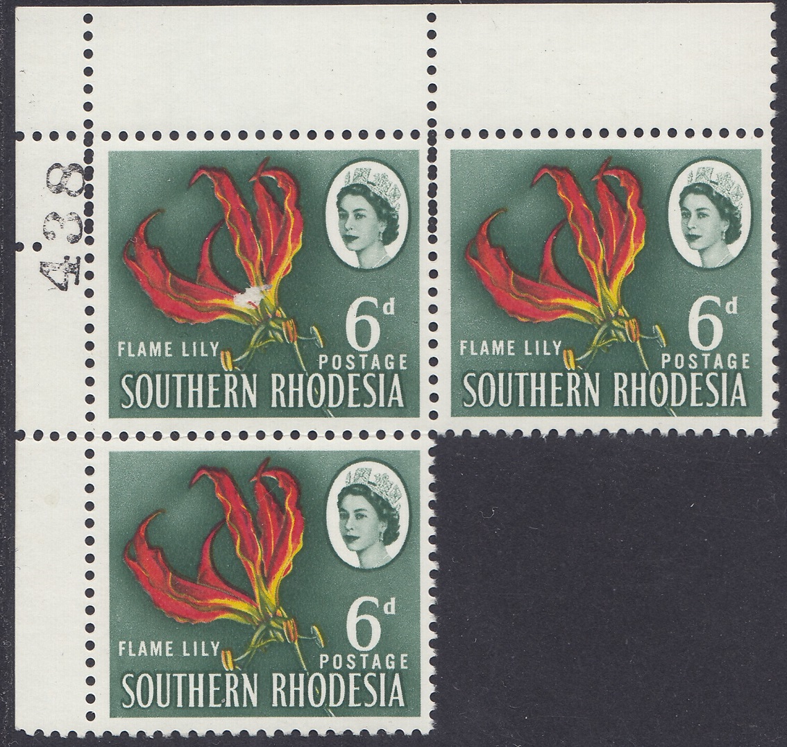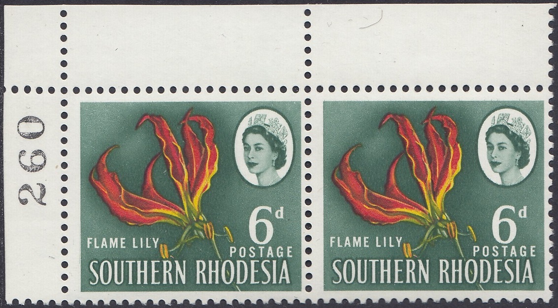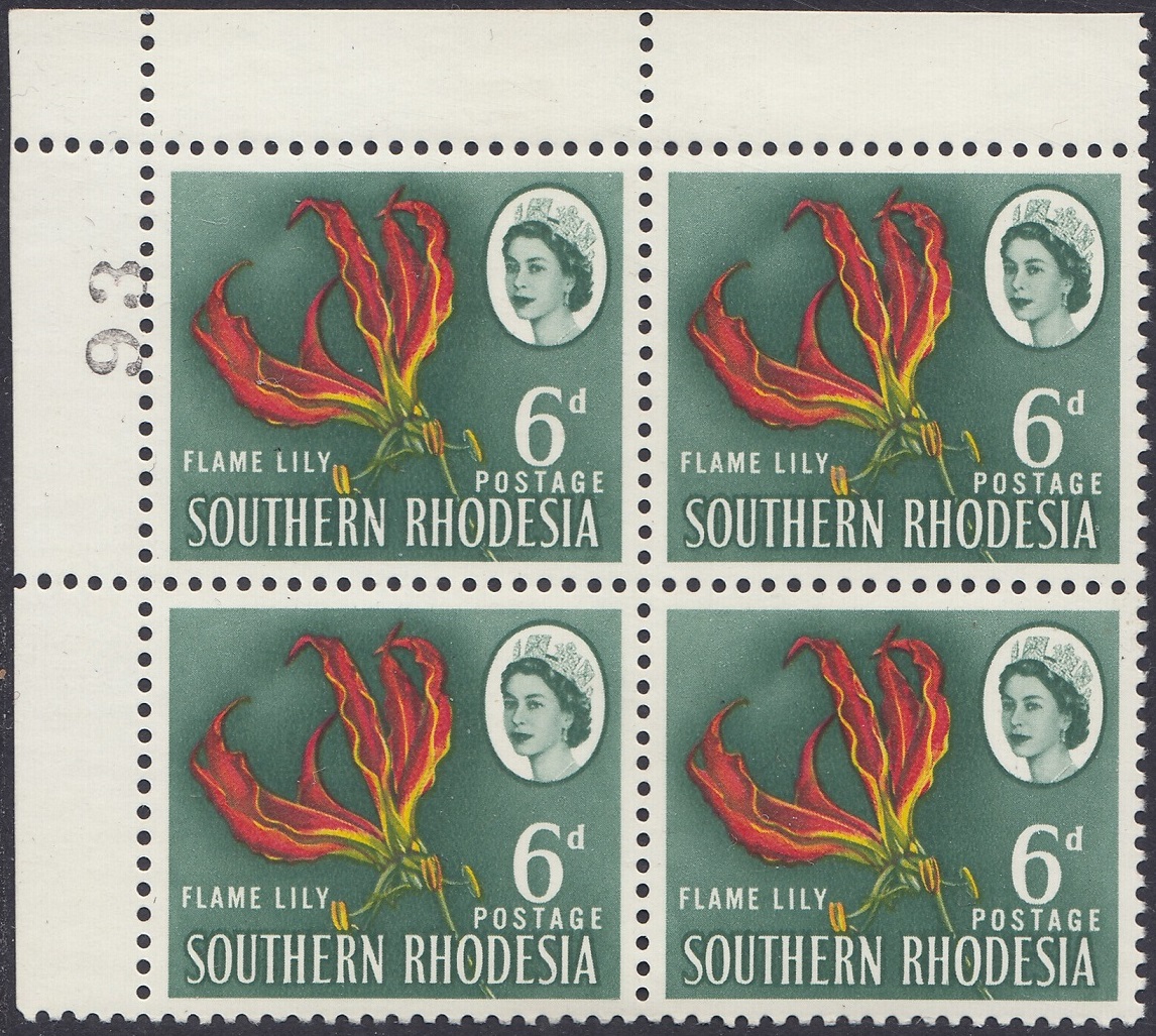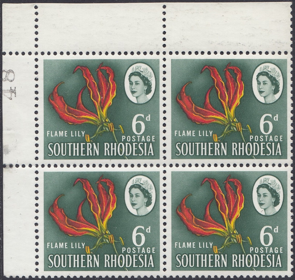 Another transparency was the source of this picture of Rhodesia’s unofficial floral emblem, the flame lily, also known as the Turk’s Cap or gloriosa lily. Originally rendered in two colours, a third colour, yellow, was found necessary and a background similar to that of the Fiji 8d. “Hibiscus” stamp (now 9d.) was requested and effected.