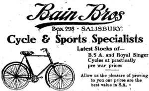 Bain Bros was a sports and cyclist specialist store located in Salisbury. In addition to a wide range of sporting goods, the business sold a multitude of cycle brands including Hercules, Royal Singer and BSA. The back of the building also had a workshop for repairs.