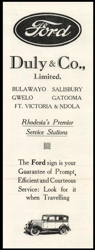 Duly & Co Ltd were located in Bulawayo. The business was started by Charles Duly, a fully qualified engineer of 24 years of age who arrived in Bulawayo in 1894. By 1896, he had opened as a Bicycle Dealer in Abercorn St. In 1902, he imported the first car into Rhodesia and by 1911 the Company was appointed as a “Dealer” for Ford Motor Product.