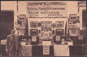 Glenville Tobacco Plantations was located in Bulawayo. The business was run by Michael (Max) Pevsner – a Russion Jew who emigrated to Rhodesia after the Anglo-Boer War. In 1907 Pevsner purchased the nine acre Glenville Farm, located on the outskirts of Bulawayo. He was one of the early pioneers of tobacco growing in Rhodesia and was believed to the be the largest grower of Turkish tobacco in the world.