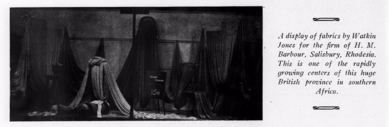 “With the influx of white colonists, mercantile organizations are expanding and display is keeping pace. A. Watkin Jones, display manager for the H. M. Barbour Department Store, Salisbury, describes the window situation in his adopted country in an Interesting article appearing in “Display,” London window magazine. He points out that while the province was practically devoid of whites thirty years ago, stores are now flourishing and the planters and their families demand the same styles in apparel and house furnishings followed in Great Britain.” – 1930