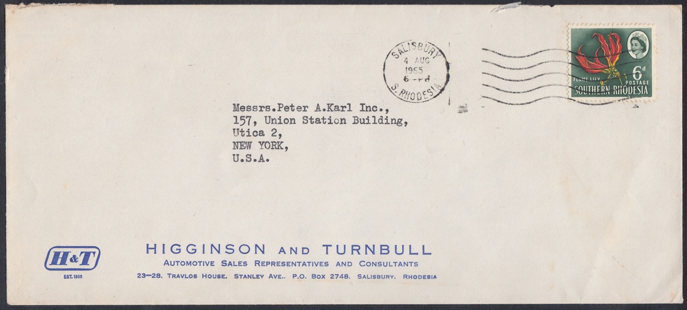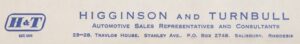 Higginson and Turnbull were located at 23-28 Travlos House, Stanley Avenue, Salisbury. The business was established in 1900 and were automotive sales representatives and consultants for items such as bicycles, automobiles and parts, hardware, tools, domestic appliances, agricultural equipment, clothing and leather manufacuturing, furniture, paints, electrical and mining machinery.