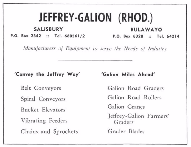 Jeffrey-Galion (Rhodesia) (Pvt) Ltd was located on the corner of St David’s Road and Cecil Avenue, Salisbury. In September of 1951, Jeffrey-Galion (Pty) Limited, specialists in road machinery and industrial equipment, was officially opened in Salisbury.The company was an African company whose parent companies were in America, Canada and Britain.