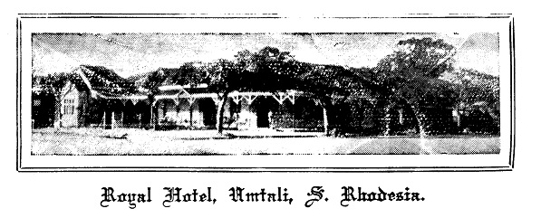The Royal Hotel, Umtali was positioned in the centre of Main Street and faced the public gardens. The hotel was established in the 1890s and by 1927 the 24 room hotel became part of Meikles Associated Hotels.
