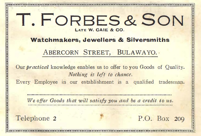 Thomas Forbes arrived in Cape Town from Scotland in 1905 and proceeded to Bulawayo where he joined the well-known firm of Mr. William Caie, one of the leading watchmakers and jewellers in the town. Held the position of head of the watch and clock repairing department.