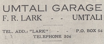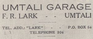 The garage services were run by Major Francis Reginald Lark (1881-1948). Lark was born in Australia in 1881. In 1902 he joined the Cape Mounted Rifles, and afterwards when he came to Rhodesia, joined the B.S.A. Police. In 1920 Major Ingham took command in Umtali district and Lark assisted him as Lieutenant. In 1921 he became District Commander of Melsetter District and was promoted to Captain, and finally before retirement became a Major.