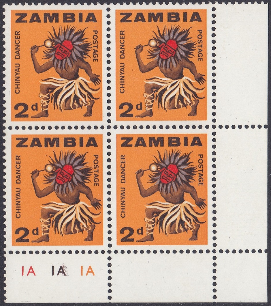 Zambia Zambia Philately: 1964 Independence First Definitive Issue – 2d Chinyau Dancer James Gavin 24/10/1964 Details Subject: Chinyau Dancer Designer: Gabriel Ellison Printer: Harrison & Sons Ltd. Process: Photogravure Paper: Watermark: None Perf: 14.5 comb Cylinders: 1A x 3 Sheet: R10 x 12 Quantity: Reprintings: 3 January 1966 24 August 1966 Cylinder Numbers Sheet Numbers Share this: Share on Facebook (Opens in new window) Facebook Share on X (Opens in new window) X Like this:Like Loading... Related