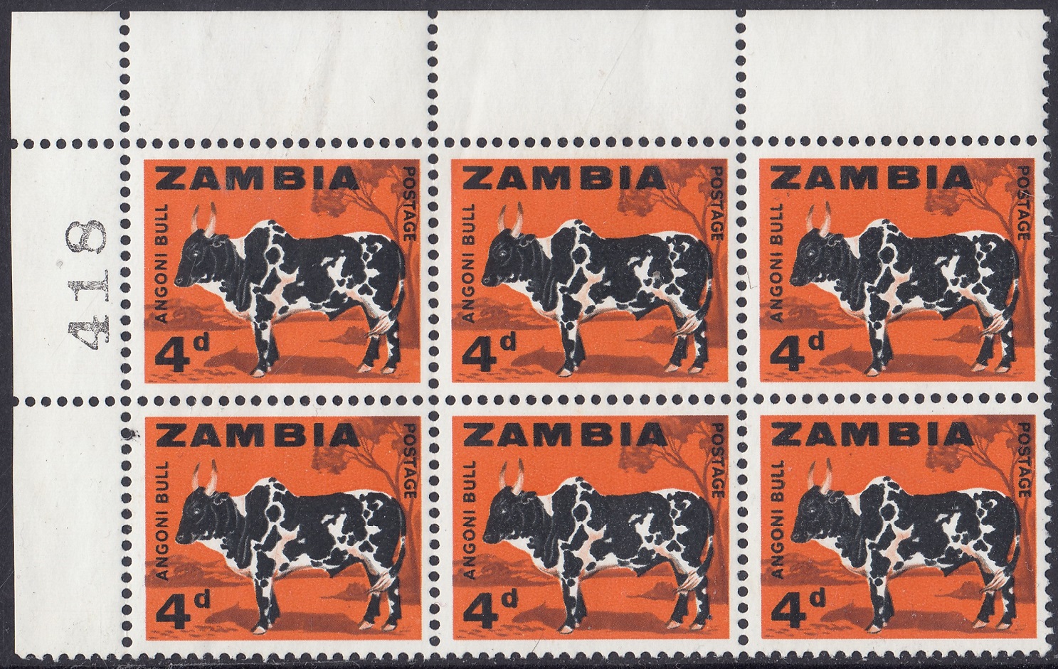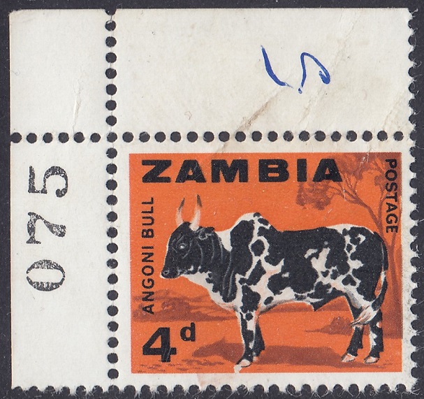 Zambia Zambia Philately: 1964 Independence First Definitive Issue – 4d Angoni Bull thedigitalphilatelist 24/10/1964 Details Subject: Angoni Bull Designer: Gabriel Ellison Printer: Harrison & Sons Ltd. Process: Photogravure Paper: Watermark: None Perf: 14.5 comb Cylinders: 1A (), 1A (), 1A () Sheet: R12 x 10 Quantity: Reprintings: 26 October 1965 24 August 1966 Sheet Numbers Share this: Share on Facebook (Opens in new window) Facebook Share on X (Opens in new window) X Like this:Like Loading... Related