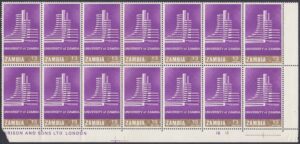 Zambia Zambia Philately: 1966 University Issue – 1/3d University of Zambia James Gavin 12/07/1966 Details Designer: Gabriel Ellison Printer: Harrison & Sons Ltd., London Process: Photogravure Paper: Watermark: None Perf: 14.5 Cylinders: 1A (), 1A () 1B (Green), 1B (Copper) Sheet: R5 x 12 Quantity Cylinder Numbers