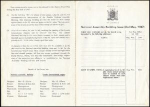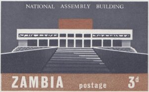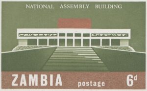 On 2nd May 1967, the release of two stamps, value 3d and 6d., will commemorate the inauguration of the Zambia National Assembly Building. This imposing building provides the motif for both stamps against black on the 3d. value and green on the 6d. value. The top centre-piece of the structure and the base of the stamps shown in gold.