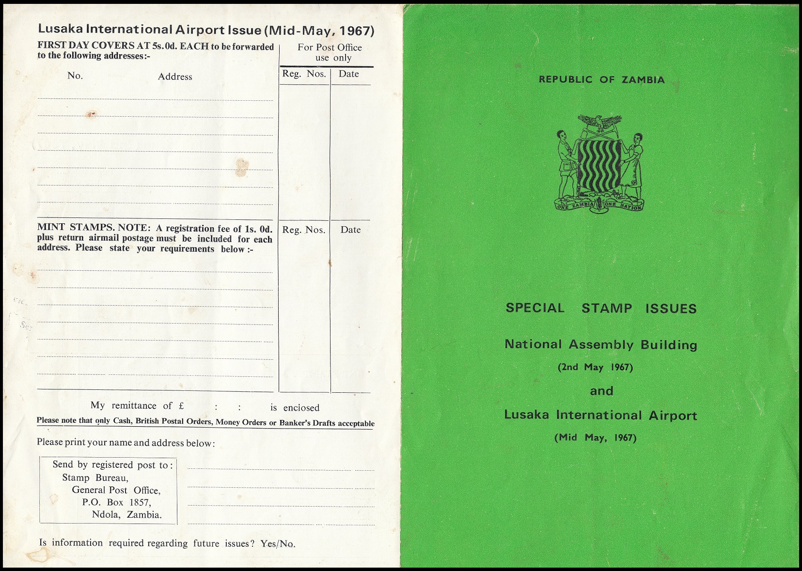A distinctive first day cover for the issue was available at 2s. 9d. per cover. This included service and registration fees and airmail postage. All first day covers purchased through the Stamp Bureau, Ndola, bears the cancellation date-stamp impression of the post office established at the National Assembly Building.
