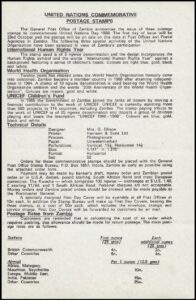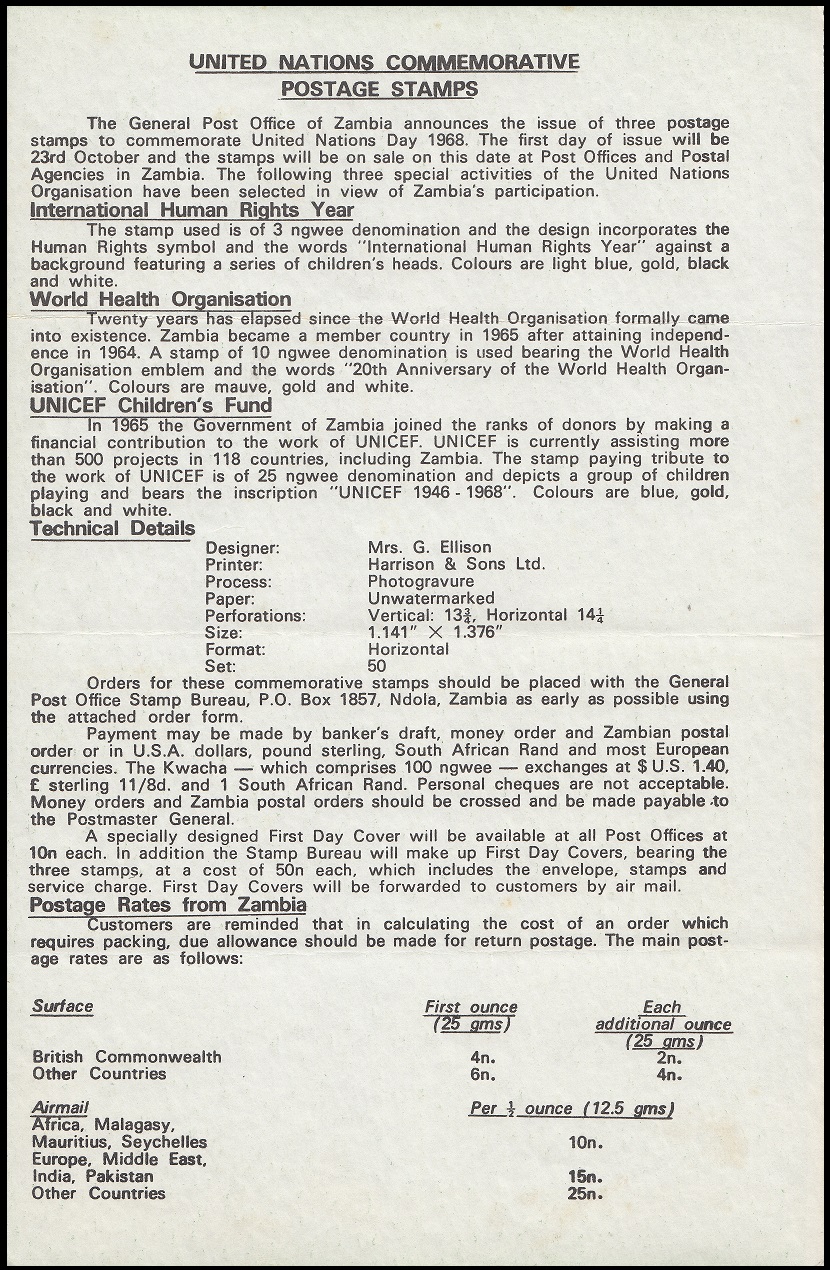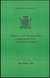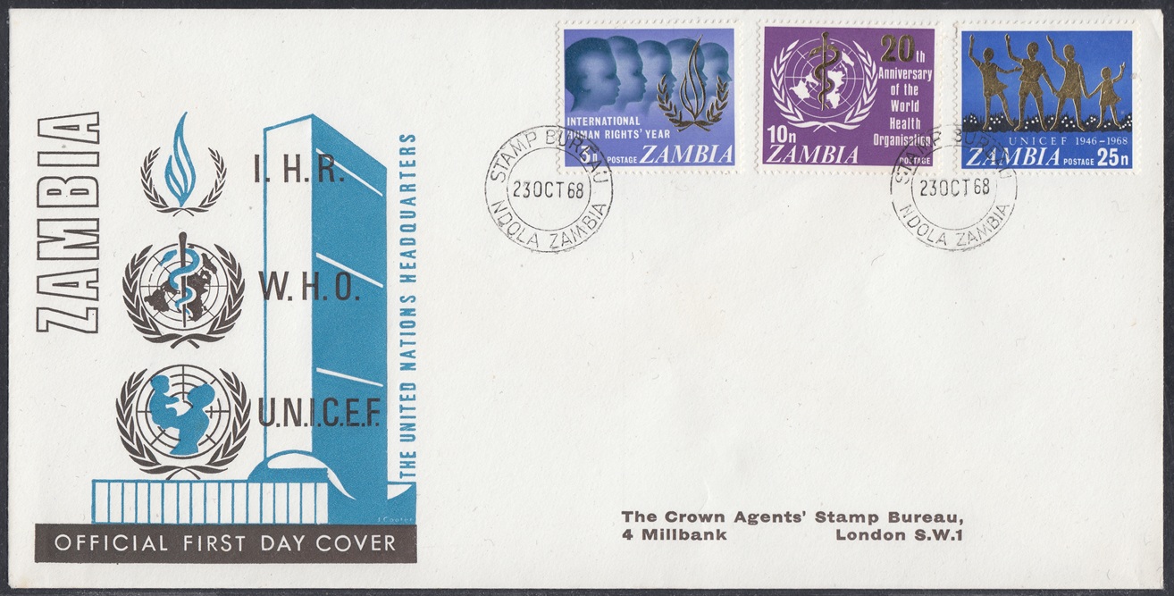 The General Post Office of Zambia announces the issue of three postage stamps to commemorate United Nations Day 1968. The first day of issue will be 23rd October and the stamps will be on sale on this date at Post Offices and Postal Agencies in Zambia. The following three special activities of the United Nations Organisations have selected in view of Zambia’s participation.