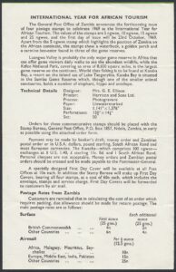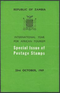 The General Post Office of Zambia announces the forthcoming issue of four postage stamps to celebrate 1969 as the International Year for African Tourism. The values of the stamps are 5 ngwee, 10 ngwee, 15 ngwee and 25 ngwee, and the first day of issue will be 23 October, 1969. Apart from the 5 ngwee stamp which highlights the position of Zambia on the African continent, the stamps show a waterbuck, a golden perch and a carmine bee-eater found in three game reserves.
