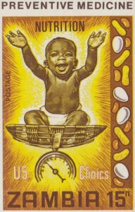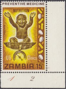 In 1968, Marianne Dettmers Wightman was a Canadian volunteer with the National Food and Nutrition Commission. She took a photo that became the ‘healthy baby’ for one of the posters that were distributed widely throughout Zambia and Malawi. Gabriel Ellison used a drawing of the healthy baby for the 15n stamp.