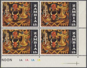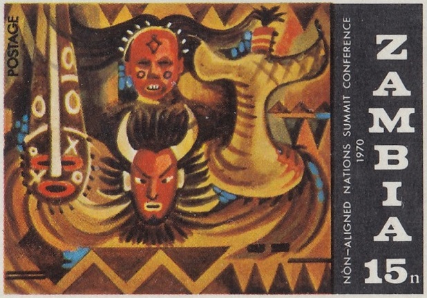 Up to 60 Nations are expected to be represented and it will be the first occasion for the specially built conference building – known as Mulungushi Hall – to be used for an international meeting. The various conference rooms of Mulungushi Hall will be decorated with murals by Mrs G. E. Ellison, and the design of the 15 ngwee stamp is an adaption of one of these murals composed of African masks. An interesting feature of this mural is that the colours blue and green are obtained by the setting in of azurite and malachite chippings to indicate Zambia’s chief export of copper.