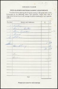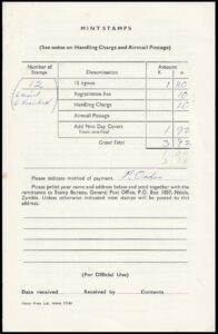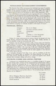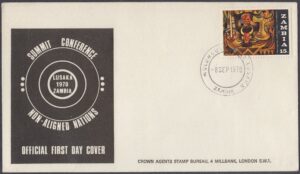 Postal facilities were available for delegates to the conference. Mail and first day covers sold by the Stamp Bureau, received a special hand-stamped cancellation “Mulungushi Hall, Lusaka.”