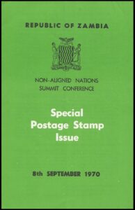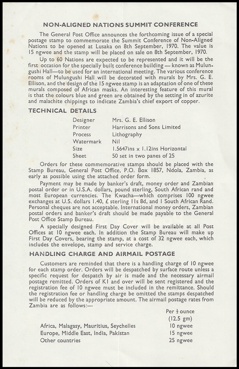 The General Post Office announces the forthcoming issue of a special postage stamp to commemorate the Summit Conference of Non-Aligned Nations to be opened at Lusaka on 8th September, 1970. The value is 15 ngwee and stamp will be placed on sale on 8th September, 1970.