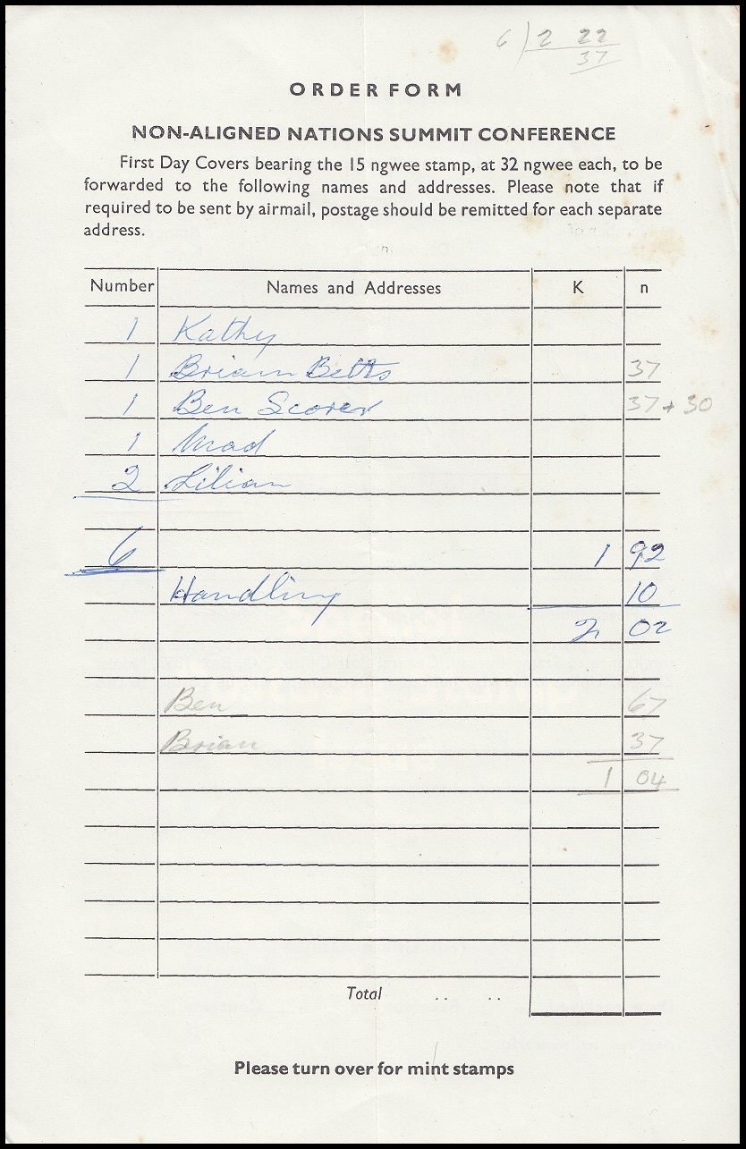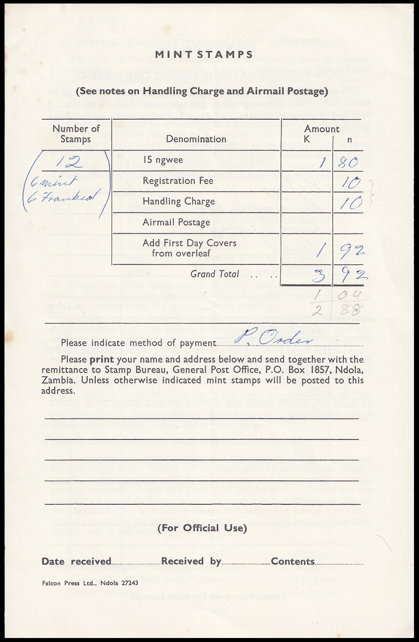 A specially designed First Day Cover was available at all Post Offices at 10 ngwee each. In addition the Stamp Bureau made up First Days Covers, bearing the stamp. at a cost of 32 ngwee each, which included the envelope, stamp and service charge.