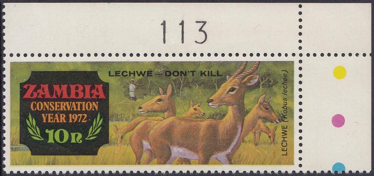 Zambia Zambia Philately: 1972 Conservation Year (1st Issue) – 10n Lechwe thedigitalphilatelist 15/03/1972 Details Subject: Lechwe (Kobus leche) Designer: John Waddington of Kirkstall Ltd, Leeds, England Printer: John Waddington of Kirkstall Ltd, Leeds, England Process: Lithography Paper: Watermark: None Perf: 13.5 Cylinders: Sheet: Quantity: Sheet Numbers Share this: Share on Facebook (Opens in new window) Facebook Share on X (Opens in new window) X Like this:Like Loading... Related