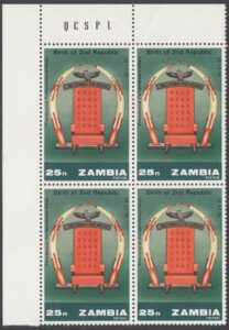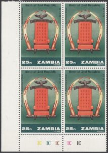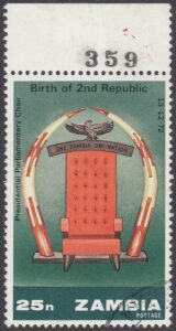 Zambia Zambia Philately: 1973 Birth of 2nd Republic – 25n Presidential Parliamentary Chair thedigitalphilatelist 13/12/1973 Details Designer: Gabriel Ellison Printer: Questa Colour Security Printers Ltd Process: Lithography Paper: Watermark: None Perf: 14 x 13.5 (comb) Cylinders: 1C (Yellow), 1C (Deep Green), 1C (Brown), 1C (Magenta), 1C (Black) Sheet: Quantity: Cylinders Sheet Numbers