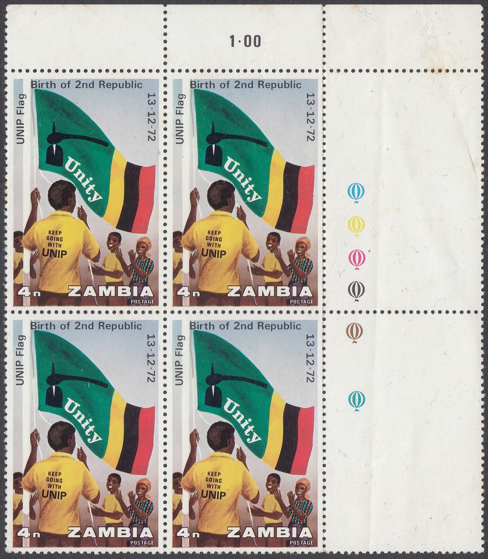 Zambia Zambia Philately: 1973 Birth of 2nd Republic – 4n U.N.I.P. Flag thedigitalphilatelist 13/12/1973 Details Designer: Gabriel Ellison Printer: Questa Colour Security Printers Ltd Process: Lithography Paper: Watermark: None Perf: 14 x 13.5 (comb) Cylinders: Sheet: Quantity:
