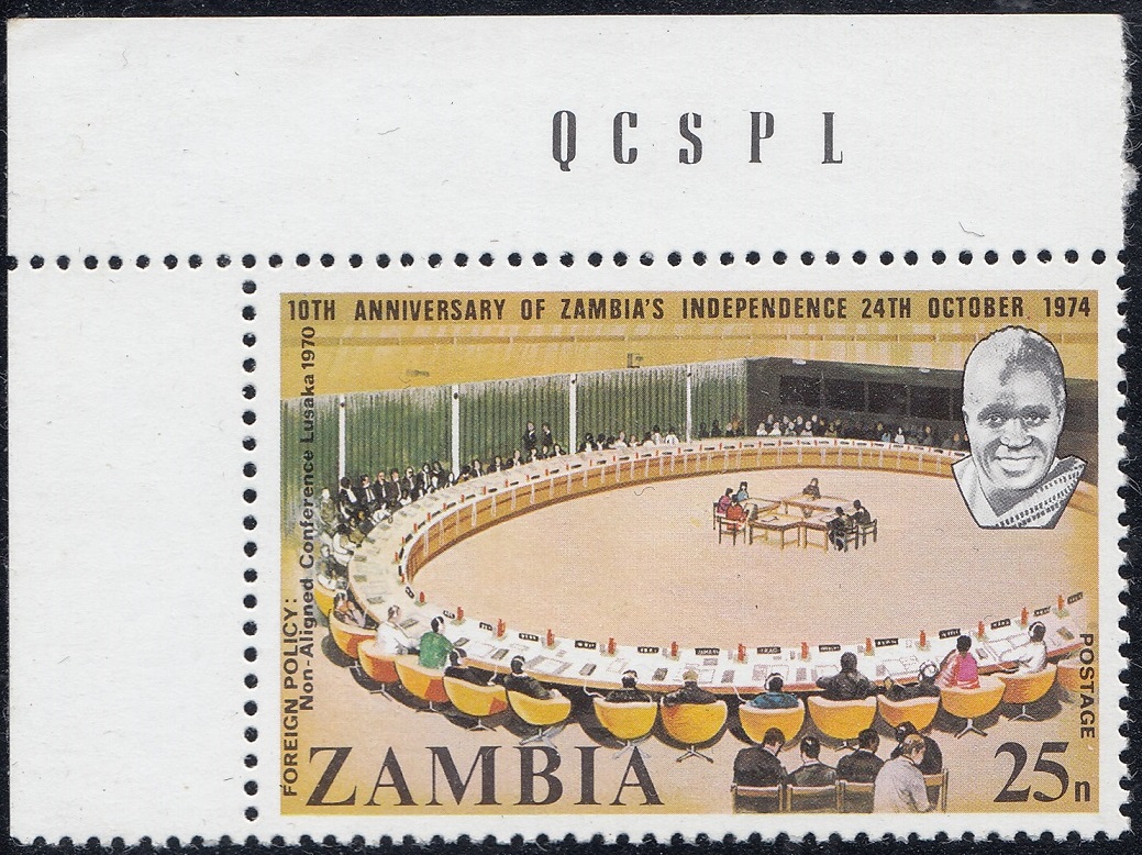 Zambia Zambia Philately: 1974 10th Anniversary of Independence – 25n Foreign Policy: Non-Aligned Conference Lusaka 1970 thedigitalphilatelist 24/10/1974 Details Subject: Non-Aligned Conference Lusaka 1970 Designer: Gyula László Vasarhelyi Printer: Questa Colour Security Printers Limited (The House of Questa) Process: Lithography Paper: Watermark: None Perf: 13.5 (comb) Cylinders: Sheet: Quantity: Share this: Share on Facebook (Opens in new window) Facebook Share on X (Opens in new window) X Like this:Like Loading... Related
