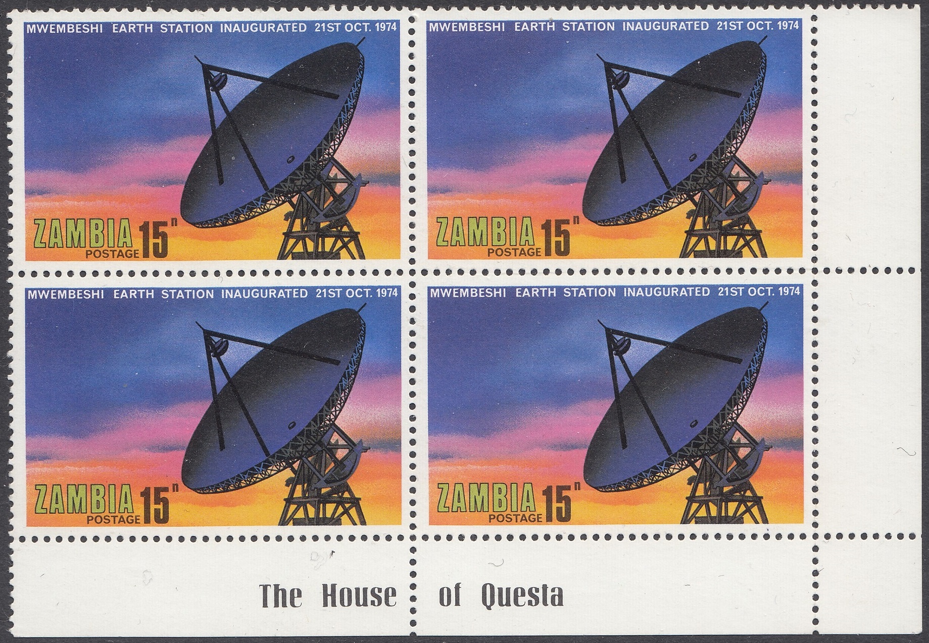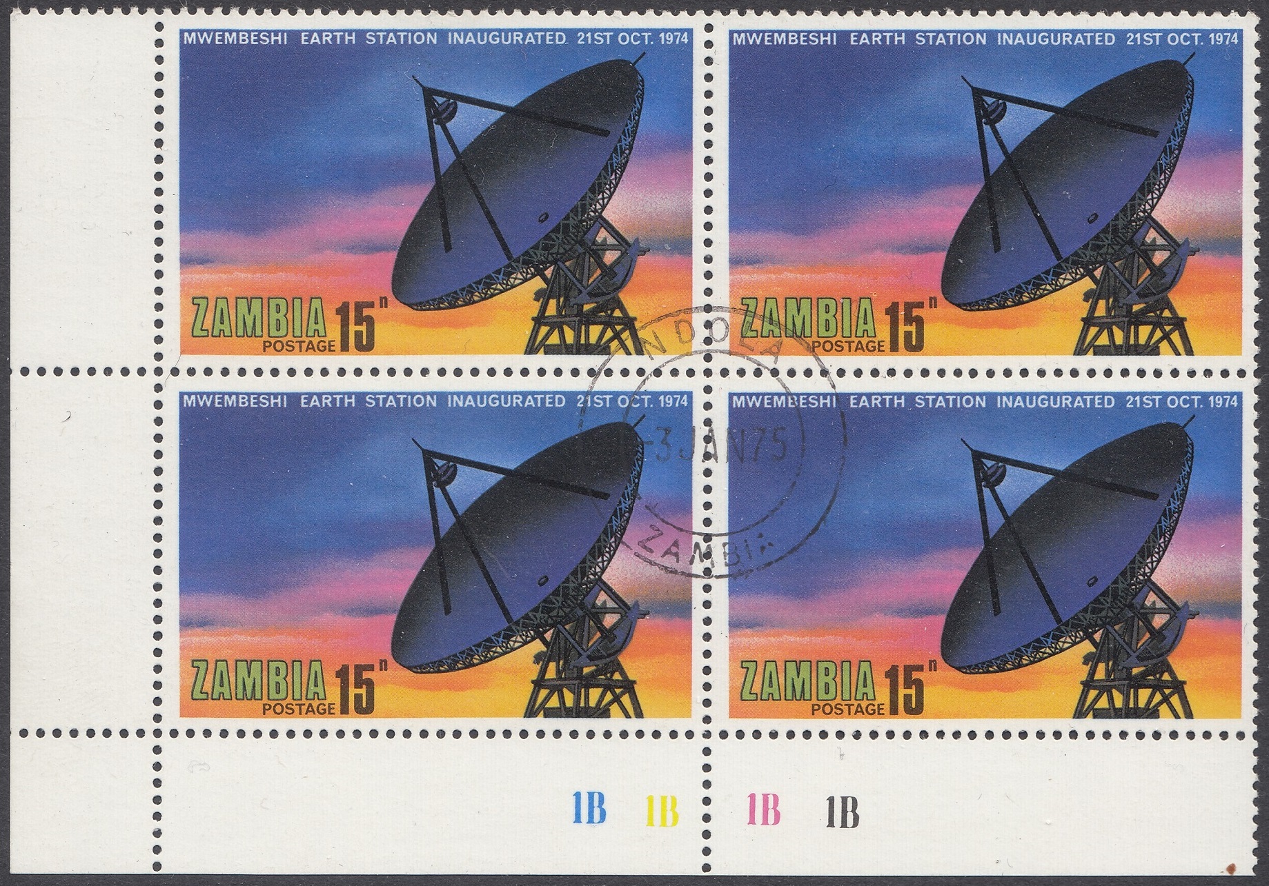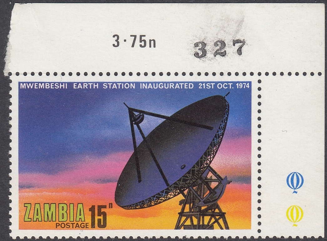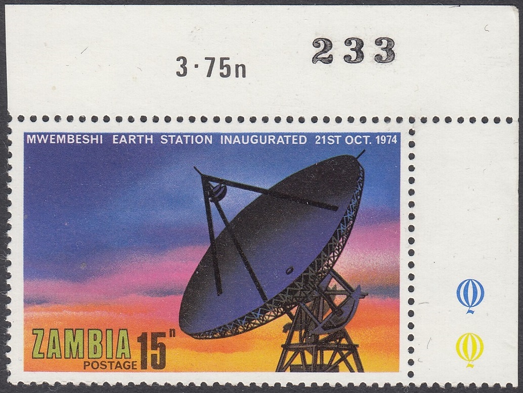 Zambia Zambia Philately: 1974 Mwembeshi Earth Station Inaugurated – 15n View at Dusk thedigitalphilatelist 16/12/1974 Details Designer: Gabriel Ellison Printer: Questa Colour Security Printers Ltd (The House of Questa) Process: Lithography Paper: Watermark: None Perf: 13.5 (comb) Cylinders: 1B (Cyan), 1B (Yellow), 1B (Magenta), 1B (Black) Sheet: Quantity: Cylinders Sheet Numbers Share this: Share on Facebook (Opens in new window) Facebook Share on X (Opens in new window) X Like this:Like Loading... Related