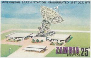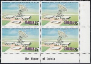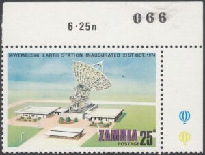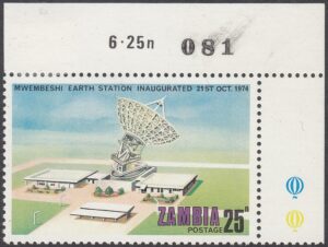 Zambia Zambia Philately: 1974 Mwembeshi Earth Station Inaugurated – 25n Aerial View thedigitalphilatelist 16/12/1974 Details Designer: Gabriel Ellison Printer: Questa Colour Security Printers Ltd (The House of Questa) Process: Lithography Paper: Watermark: None Perf: 13.5 (comb) Cylinders: Sheet: Quantity: Sheet Numbers