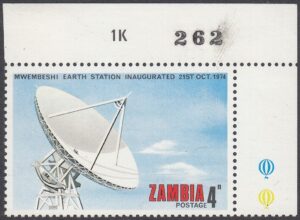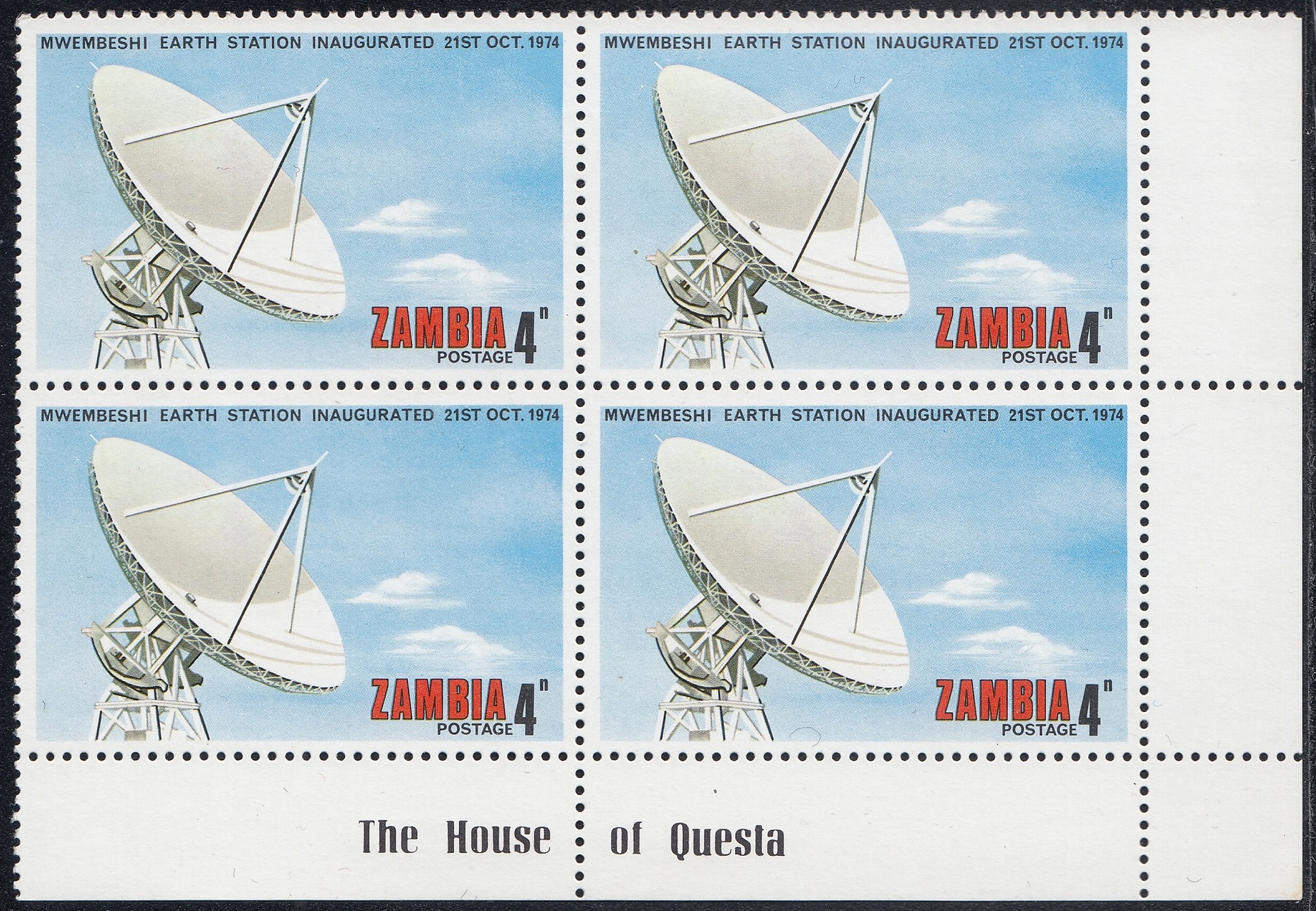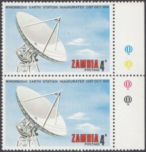 Zambia Zambia Philately: 1974 Mwembeshi Earth Station Inaugurated – 4n Dish Aerial thedigitalphilatelist 16/12/1974 Details Designer: Gabriel Ellison Printer: Questa Colour Security Printers Ltd (The House of Questa) Process: Lithography Paper: Watermark: None Perf: 13.5 (comb) Cylinders: 1D (Cyan), 1D (Yellow), 1D (Magenta), 1D (Black) Sheet: Quantity: Cylinders Sheet Numbers