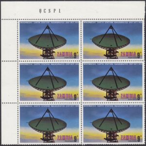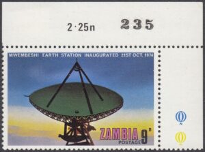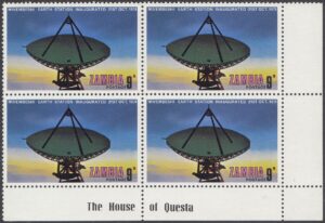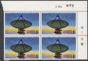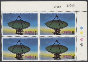 Zambia Zambia Philately: 1974 Mwembeshi Earth Station Inaugurated – 9n View at Dawn thedigitalphilatelist 16/12/1974 Details Designer: Gabriel Ellison Printer: Questa Colour Security Printers Ltd (The House of Questa) Process: Lithography Paper: Watermark: None Perf: 13.5 (comb) Cylinders: 1D (Cyan), 1D (Yellow), 1D (Magenta), 1D (Black) Sheet: Quantity: Sheet Numbers