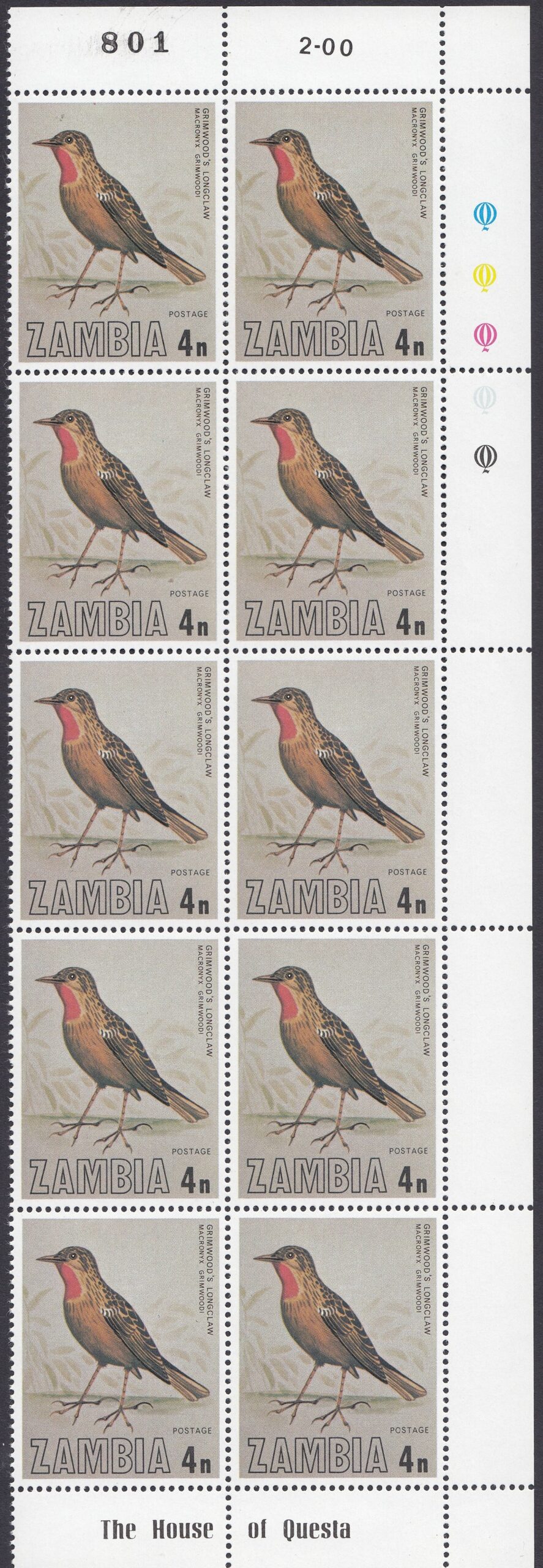 Zambia Philately: 1977 Birds of Zambia – 4n Grimwood’s Longclaw
