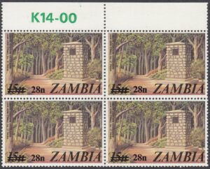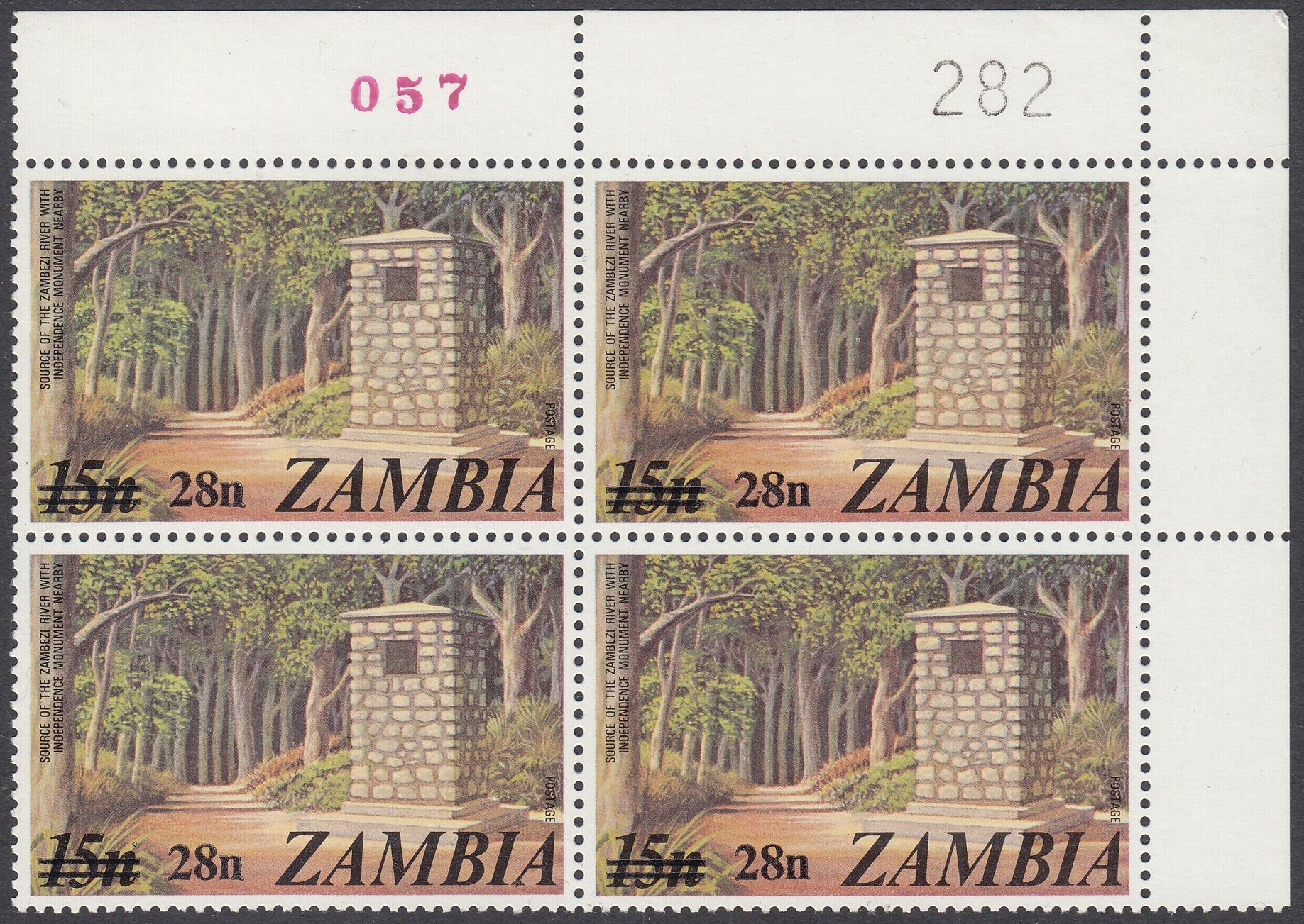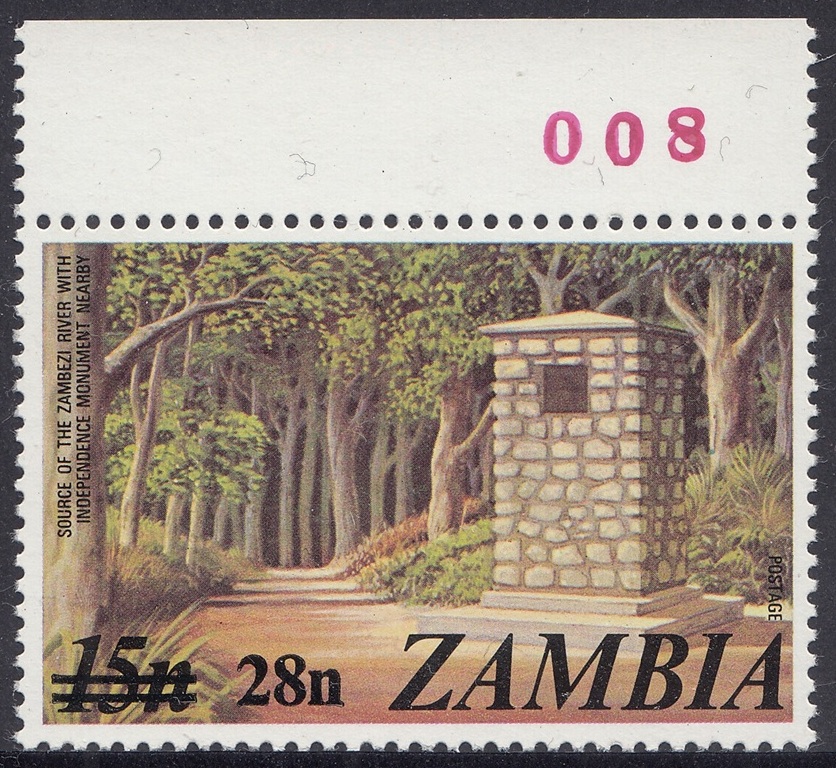 Zambia Zambia Philately: 1979 3rd Definitive Issue (New Value Overprints) – 28n on 15n Source of the Zambezi River with Independence Monument Nearby thedigitalphilatelist 15/03/1979 Details Designer: Gabriel Ellison Printer: John Waddington of Kirkstall Ltd, Leeds, England Process: Lithography Paper: Watermark: None Perf: 13 (comb) Cylinders: 1A (Yellow) 1A (Magenta) 1A (Cyan) 1A (Black) Sheet: Quantity: Sheet Numbers