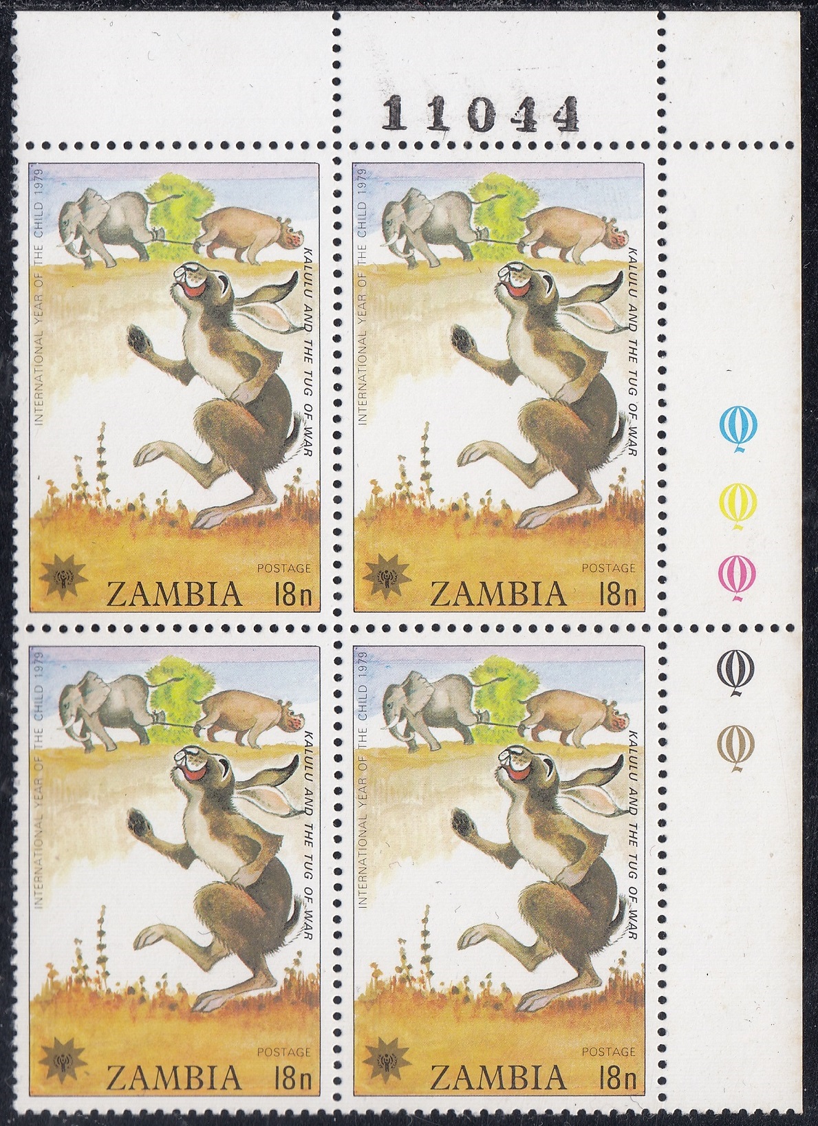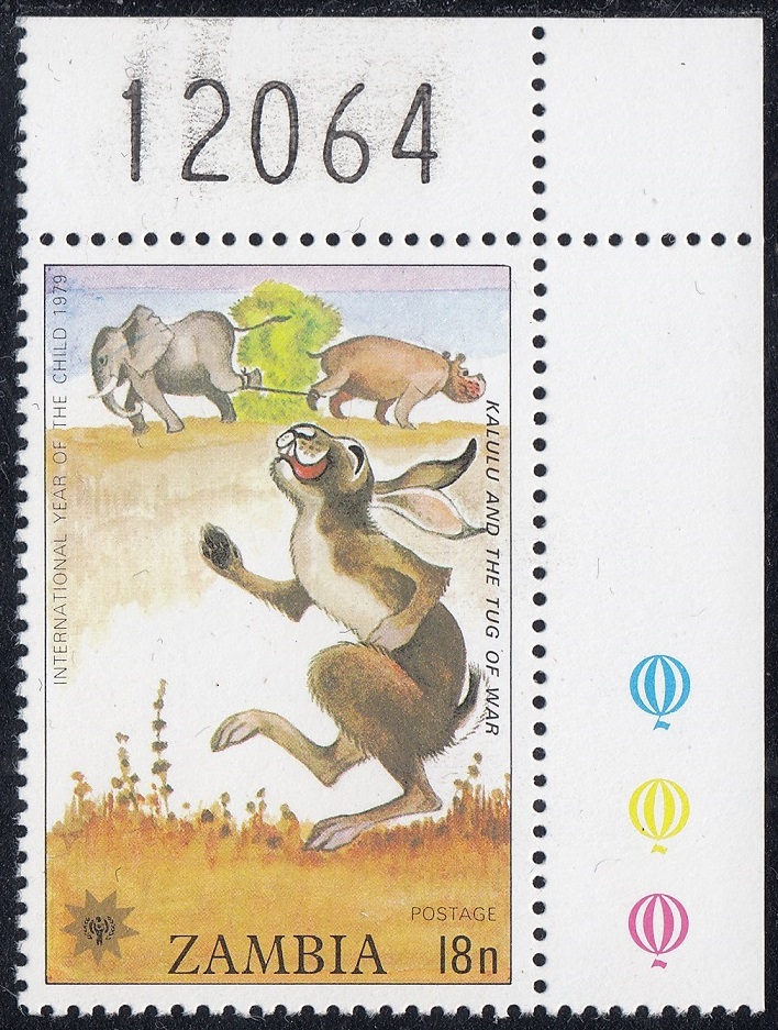 The 18n stamp depicts the story of Kalulu (hare). Kalulu is depicted as a clever and resourceful trickster. In the story depicted, he tricks Mr Elephant and Mr Hippopotamus and into a tug-of-war.