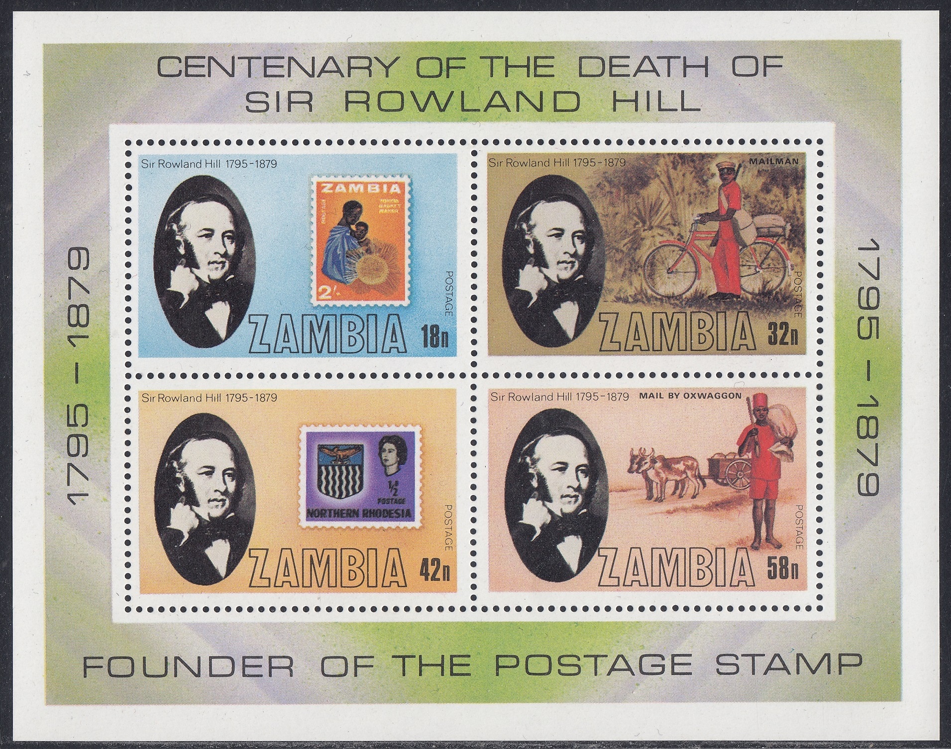 Zambia Zambia Philately: 1979 Sir Rowland Hill (1895-1979) – 1.50K Miniature Sheet thedigitalphilatelist 20/12/1979 Details Designer: Gabriel Ellison Printer: Questa Colour Security Printers Limited (The House of Questa) Process: Lithography Paper: Watermark: None Perf: 14.5 (comb) Cylinders: Sheet: Quantity:
