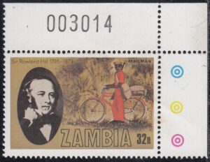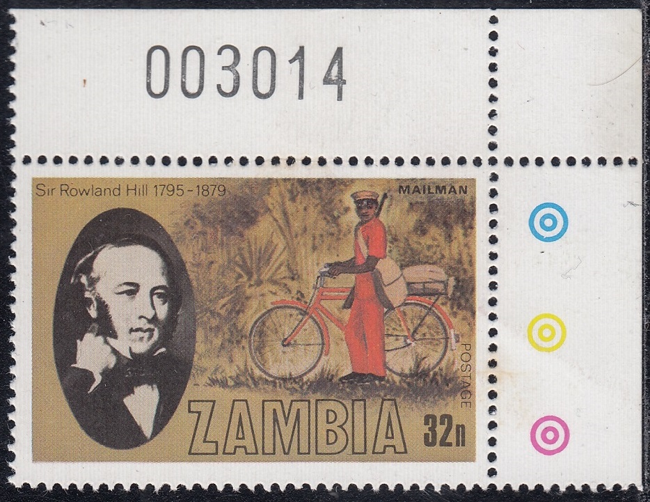 Zambia Zambia Philately: 1979 Sir Rowland Hill (1895-1979) – 32n Mailman thedigitalphilatelist 20/12/1979 Details Designer: Gabriel Ellison Printer: Questa Colour Security Printers Limited (The House of Questa) Process: Lithography Paper: Watermark: None Perf: 14.5 (comb) Cylinders: Sheet: Quantity: Sheet Numbers