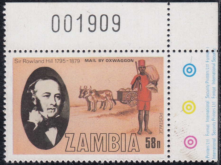 Zambia Zambia Philately: 1979 Sir Rowland Hill (1895-1979) – 58n Mail by Ox Wagon thedigitalphilatelist 20/12/1979 Details Designer: Gabriel Ellison Printer: Questa Colour Security Printers Limited (The House of Questa) Process: Lithography Paper: Watermark: None Perf: 14.5 (comb) Cylinders: Sheet: Quantity: Sheet Numbers