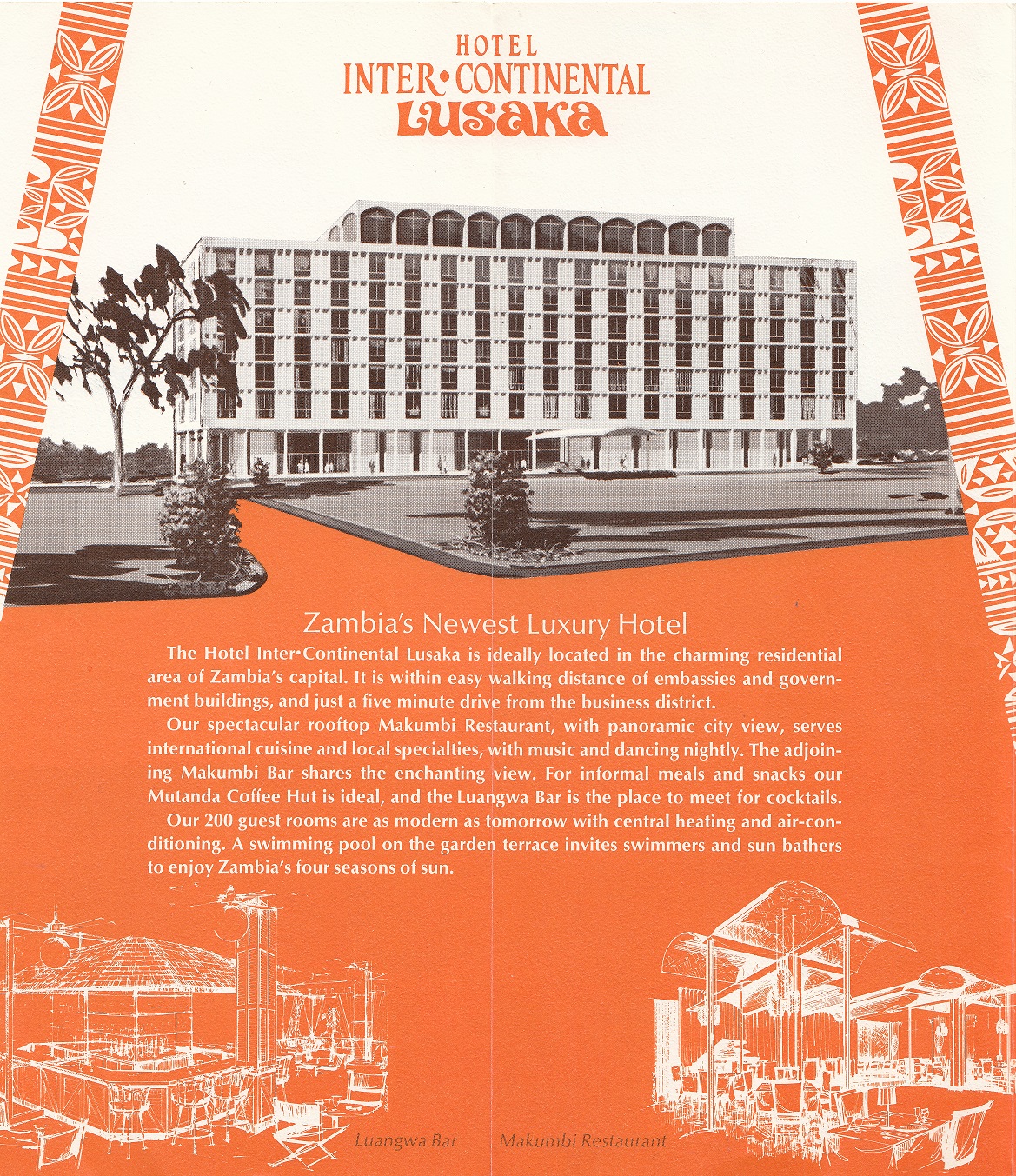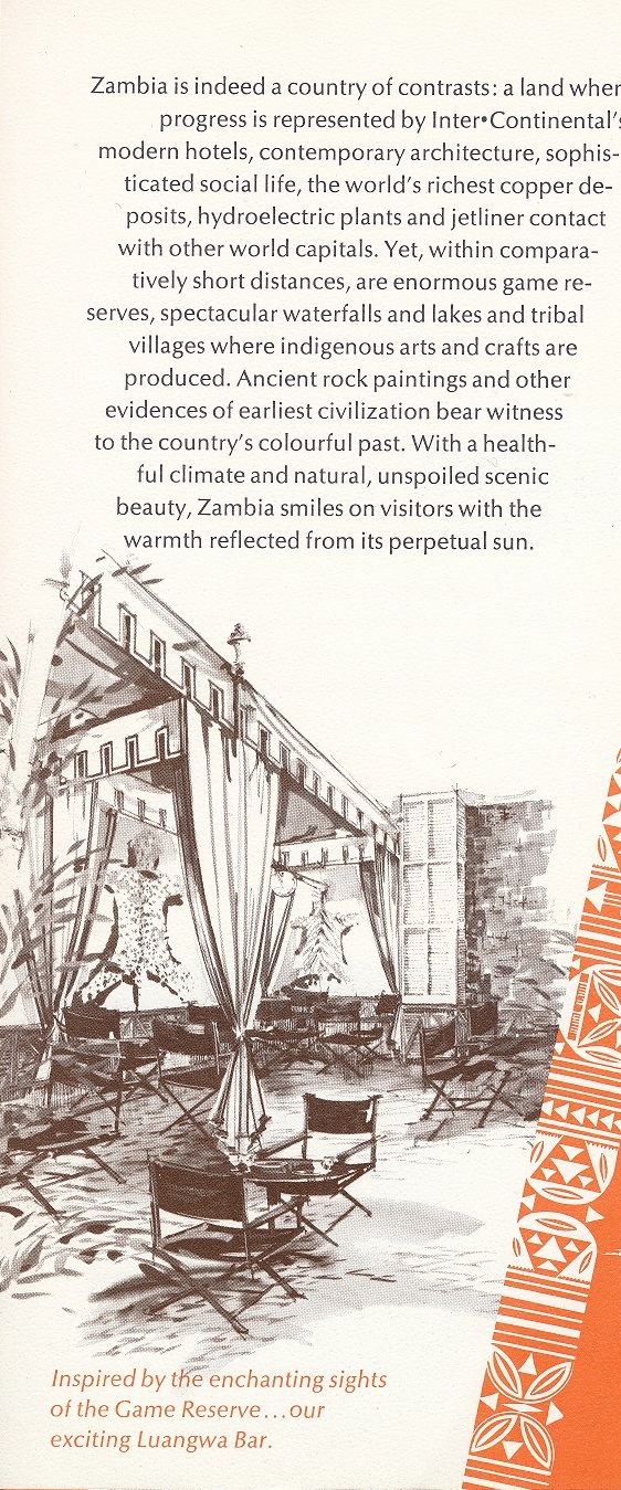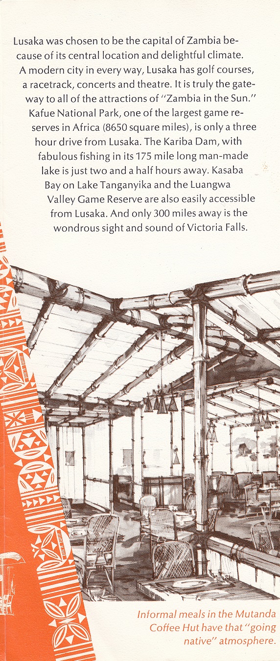 In 1966, Neal Prince hired the G.B. Designs, Inc., located out of New York City, whereby the G.B. Designs, Inc. was a partnership between Joseph Grusczak, A.I.D., President and James Ray Baker, A.I.D. to provided complete renderings for the New Construction, which consisted of various design renderings detailing of all fixed decor, provide the selection of all furniture, fixtures and soft goods, provide documentation for bids and purchasing for the public Lobby, the Mutanda Coffee Hut, Lauangwa ar, the Makumbi Rooftop Restaurant and Bar and the various Guestrooms and Suites, with the final approval by Mr. Neal Prince, for the Hotel. The renderings and designs were inspired by the local culture of Lusaka, Zambia, Africa.
