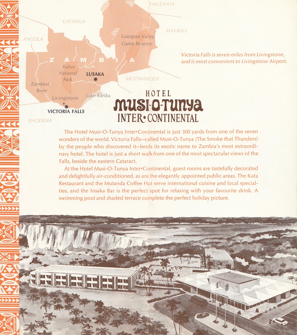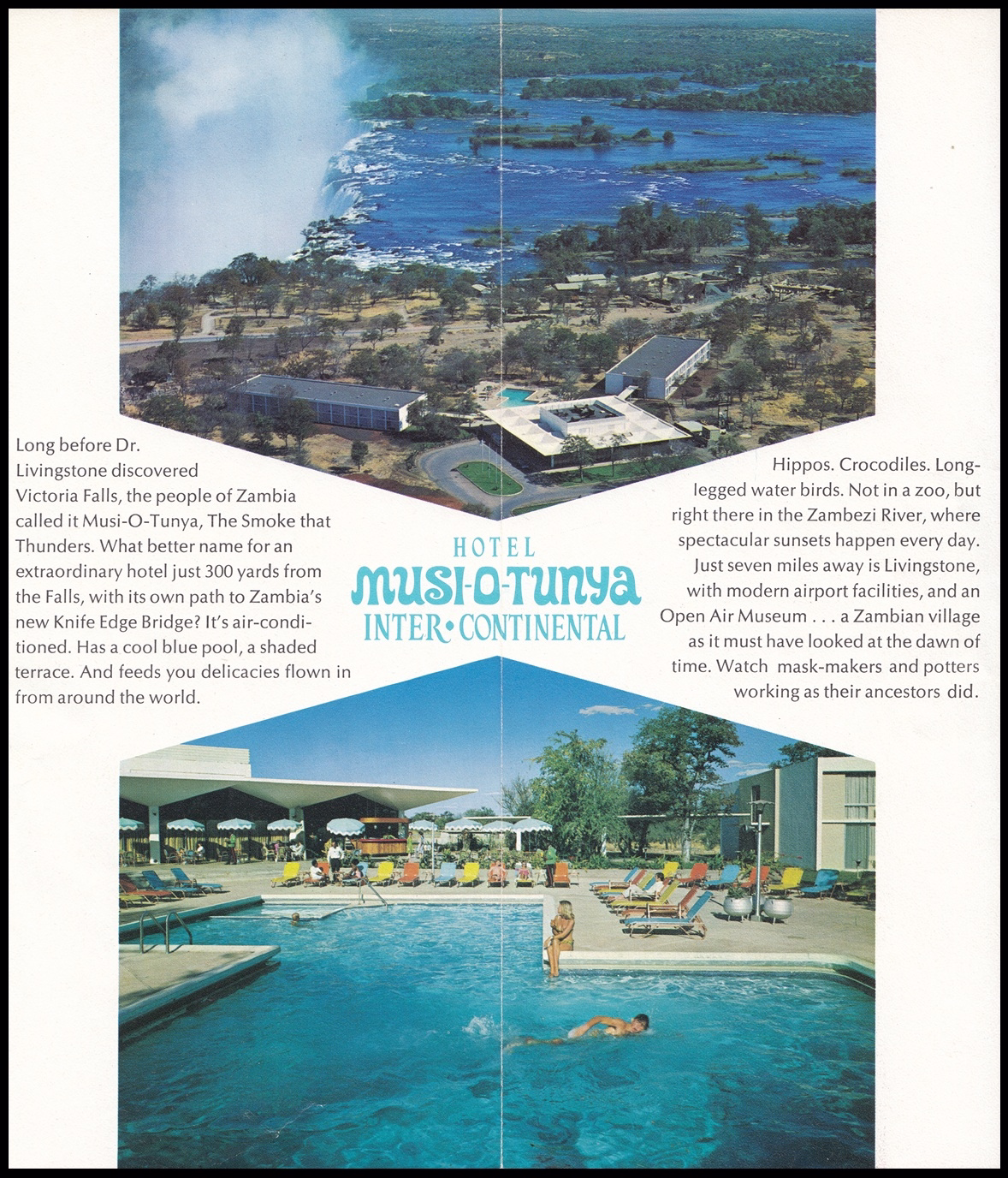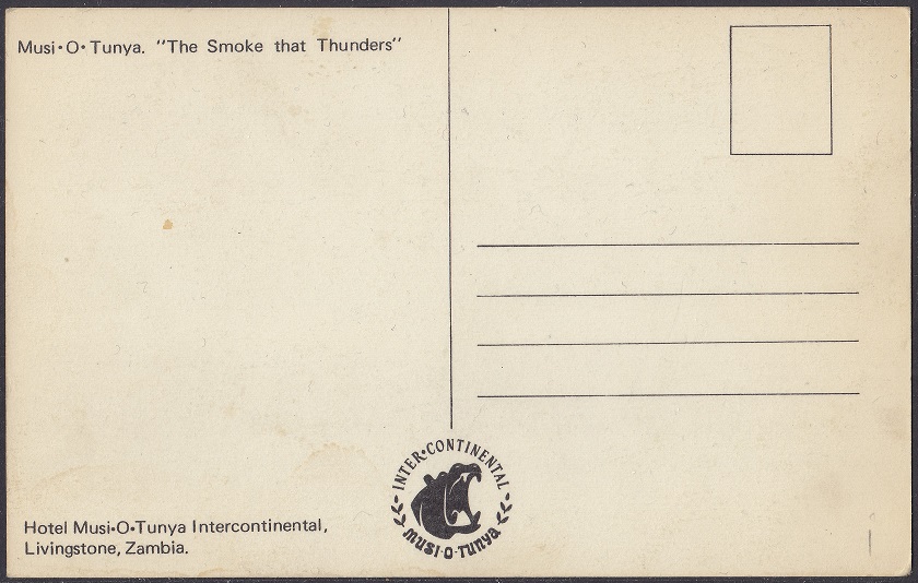 Musi-o-Tunya Inter-Continental Hotel was officially opened on 19 October 1968 by Dr Kabaleka Konoso, Minister of Natural Resources and Tourism. Robert Huyot, Presdient of Inter-Continental, and Mario di Genova, Senior Vice-President of Operations, were also present. It was located just 300 yards, on a 35 acre site, adjacent to the eastern cataract of the Victoria Falls (Musi-O-Tunya or The Smoke That Thunders), and seven miles from Livingstone.