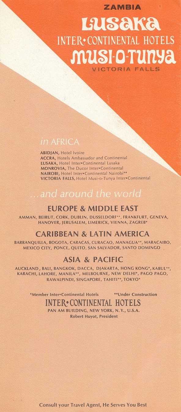 The Inter-Continental Hotel (ICH) brand was established in 1946 by Juan Trippe, founder of Pan American Airways as a division of Pan Am. ICH opened two hotels in Zambia in 1968.