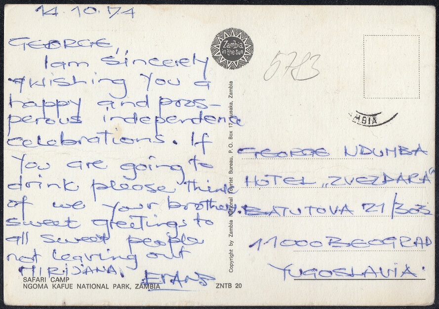 The Ngoma Safari Camp, Ngoma was opened in 1968. Located in Kafue National Park, it enabled visitors to spend a night close to nature. The camp was decorated in a rustic bush style with white walls and exposed beams.